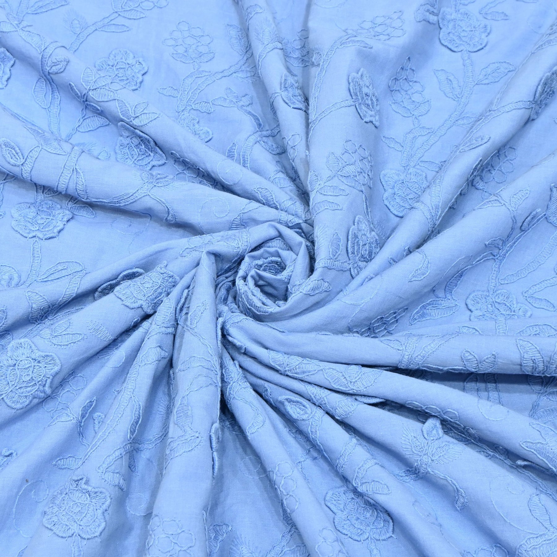 Sky Blue Color Pure Cotton Floral Thread Embroidery Fabric