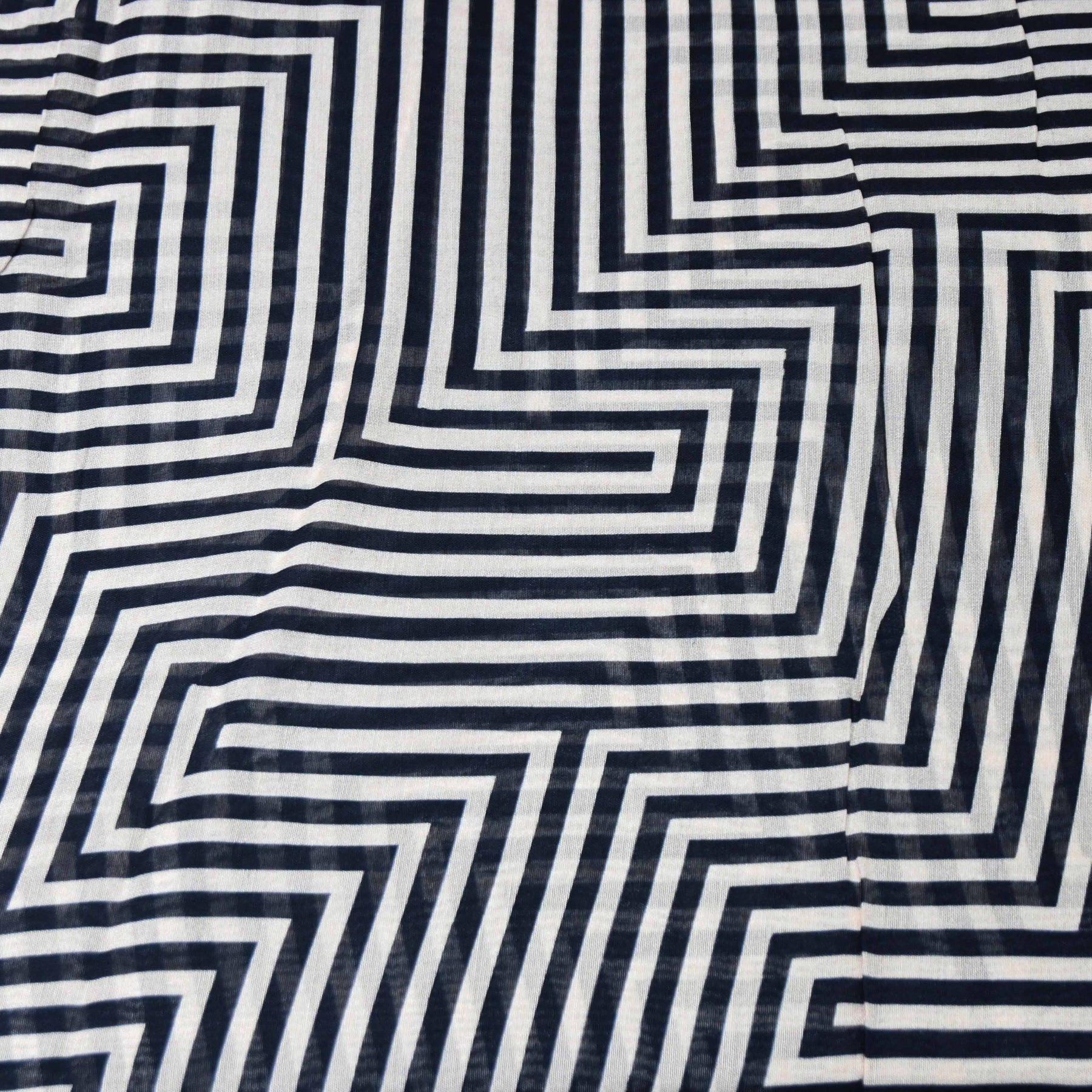 Bold and contemporary, this Zebra Stripe Muslin Fabric features striking black and ivory geometric stripes arranged in a dynamic zig-zag pattern. The high-contrast design creates a modern, eye-catching look that is perfect for statement outfits and fashion-forward collections.