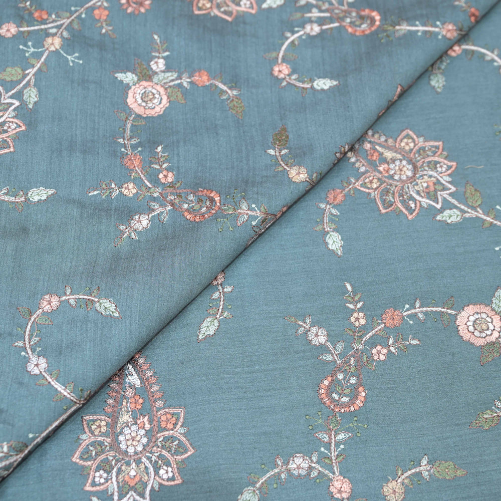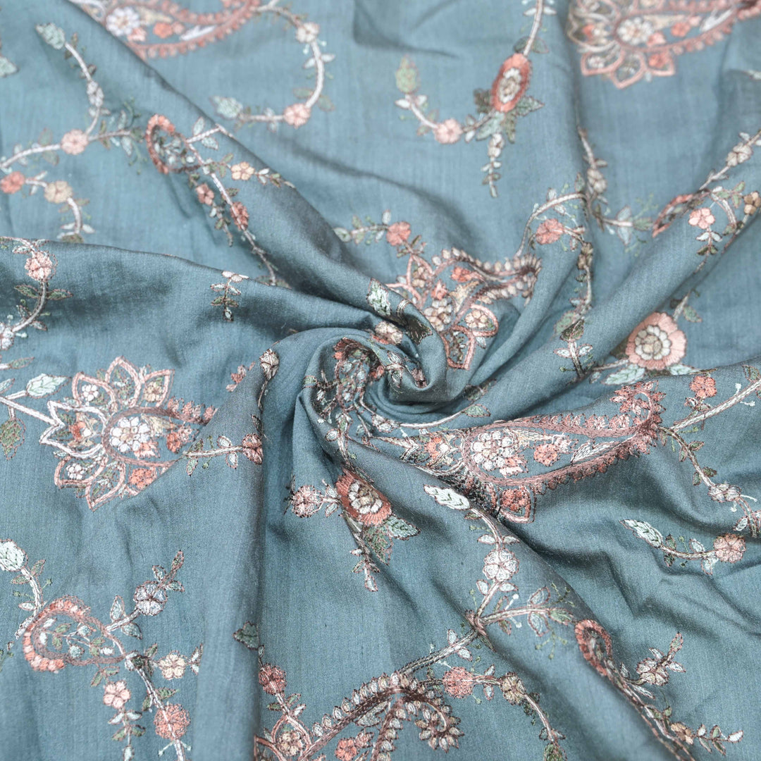 Sky Blue Color Mul Chanderi Thread with Sequins Embroidery Fabric