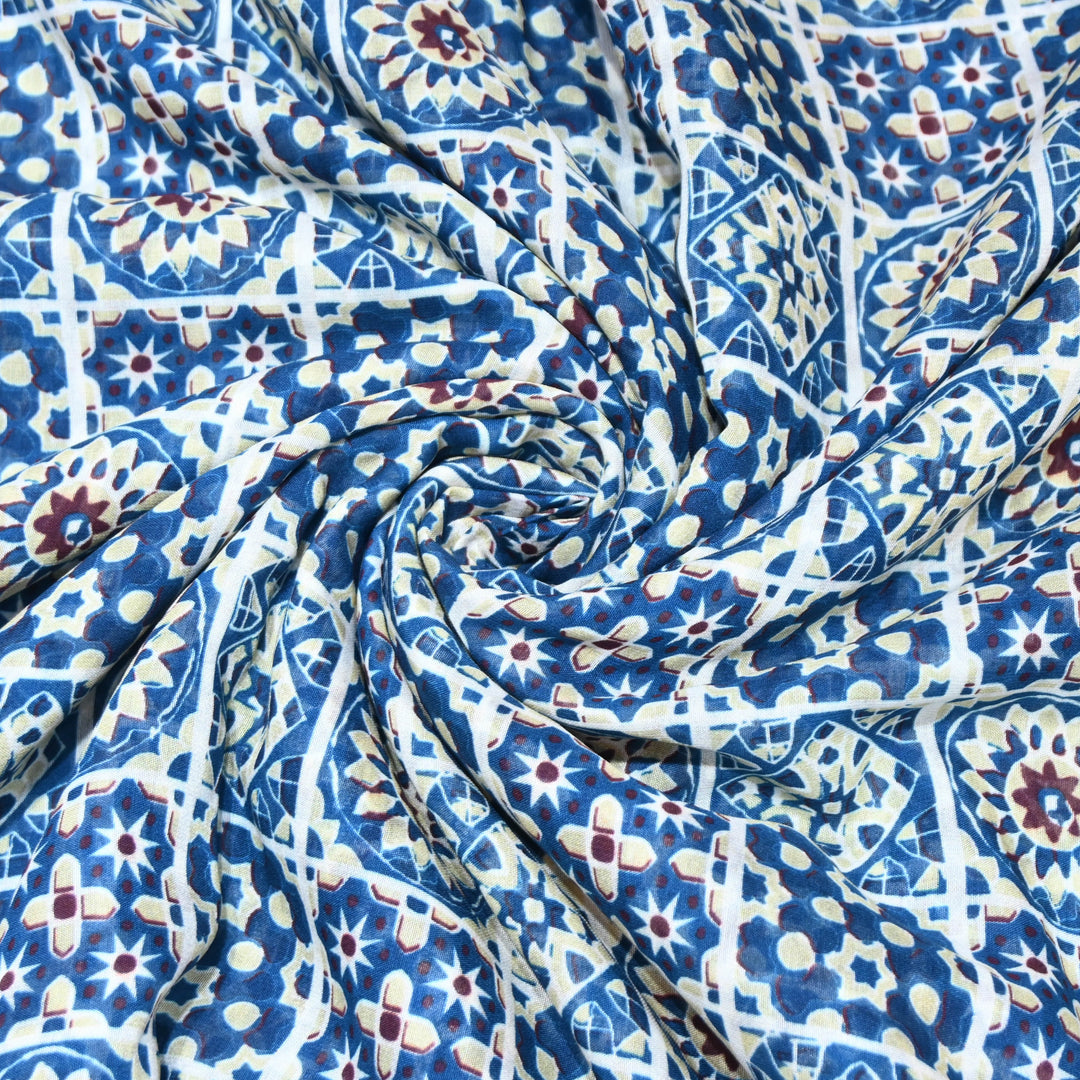 Blue Mosiac Floral Print Muslin Fabric