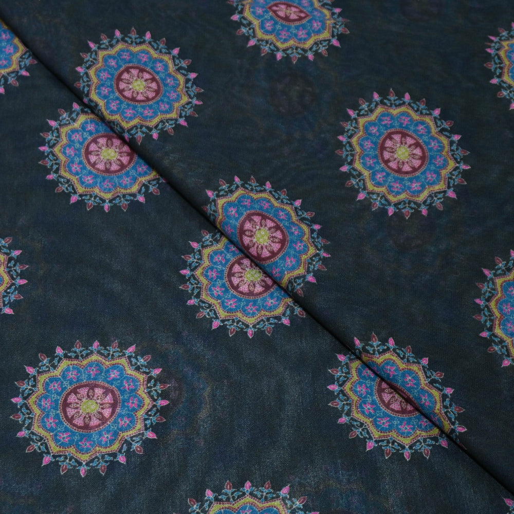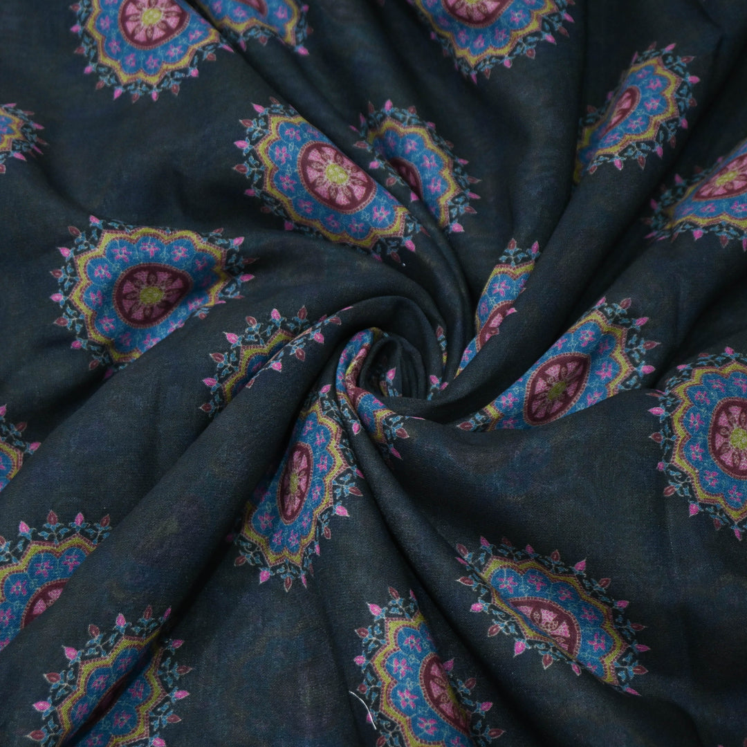 Midnight Black Mandala Print Muslin Fabric