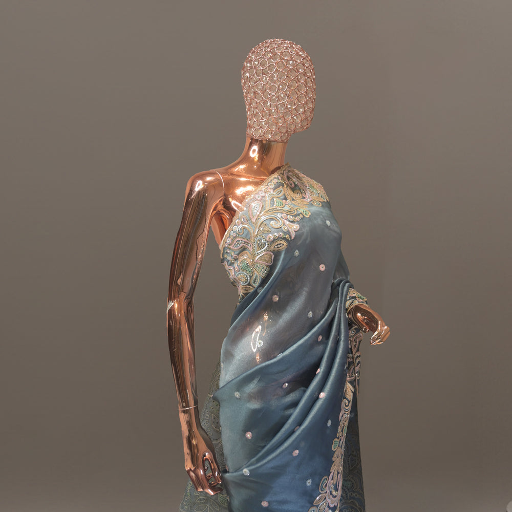 Blue Crepe Fabric with Zari & Mirrorwork Embroidery