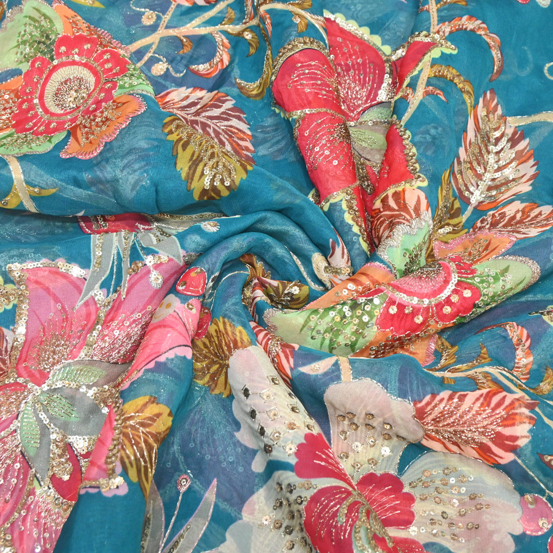 Multi Color Viscose Organza Position Print Zari Sequence Embroidery Fabric
