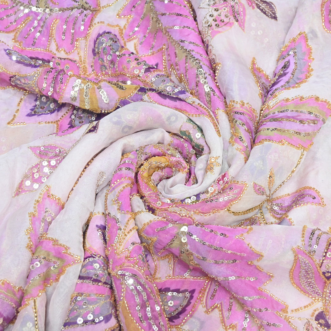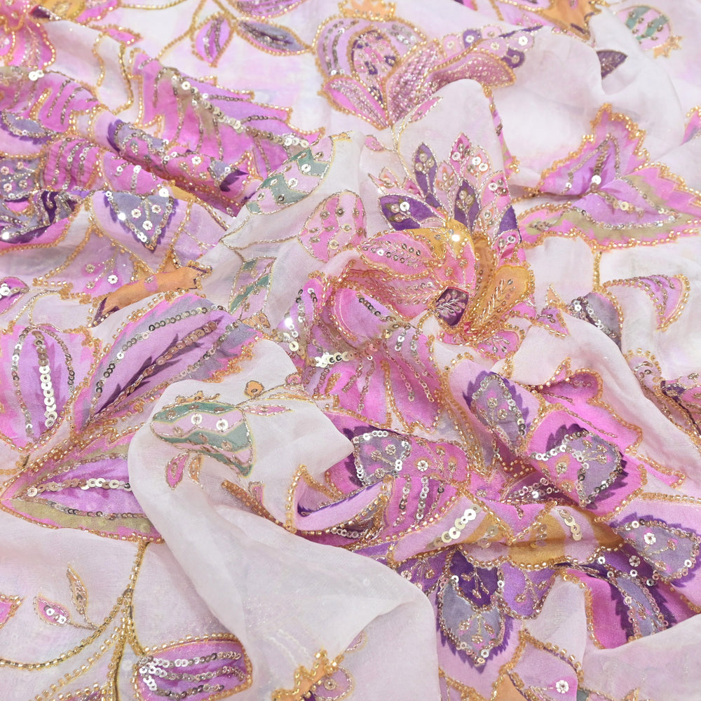 Beige Floral Organza Fabric with Post Print Zari Sequins Embroidery