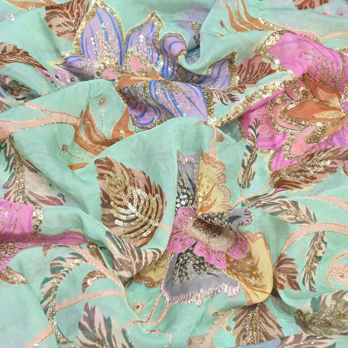 Add a touch of luxury to your collection with this Viscose Organza Fabric featuring Position Print with Zari & Sequins Embroidery. Crafted on a lightweight and slightly sheer organza base, this fabric offers a crisp texture with an elegant and structured fall.