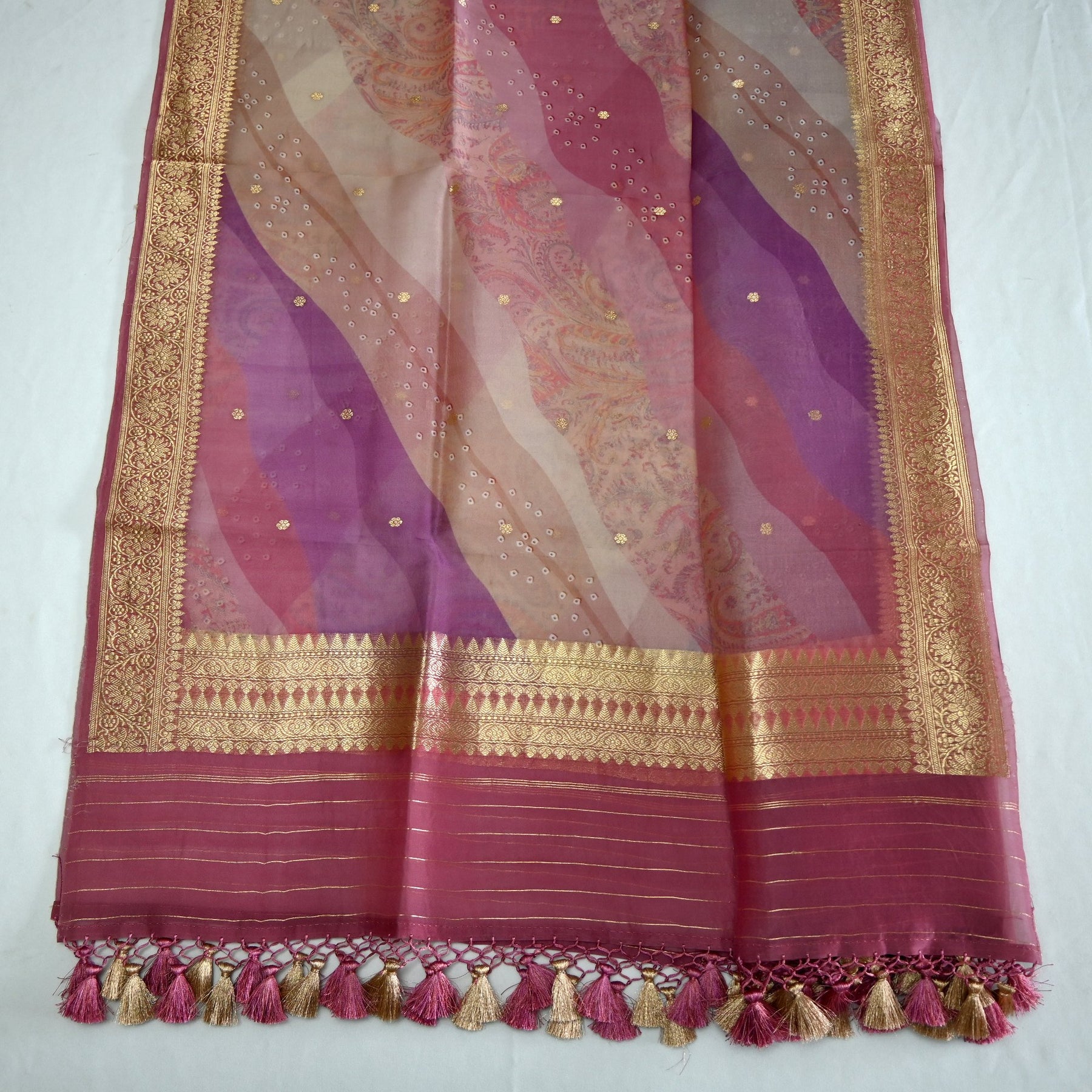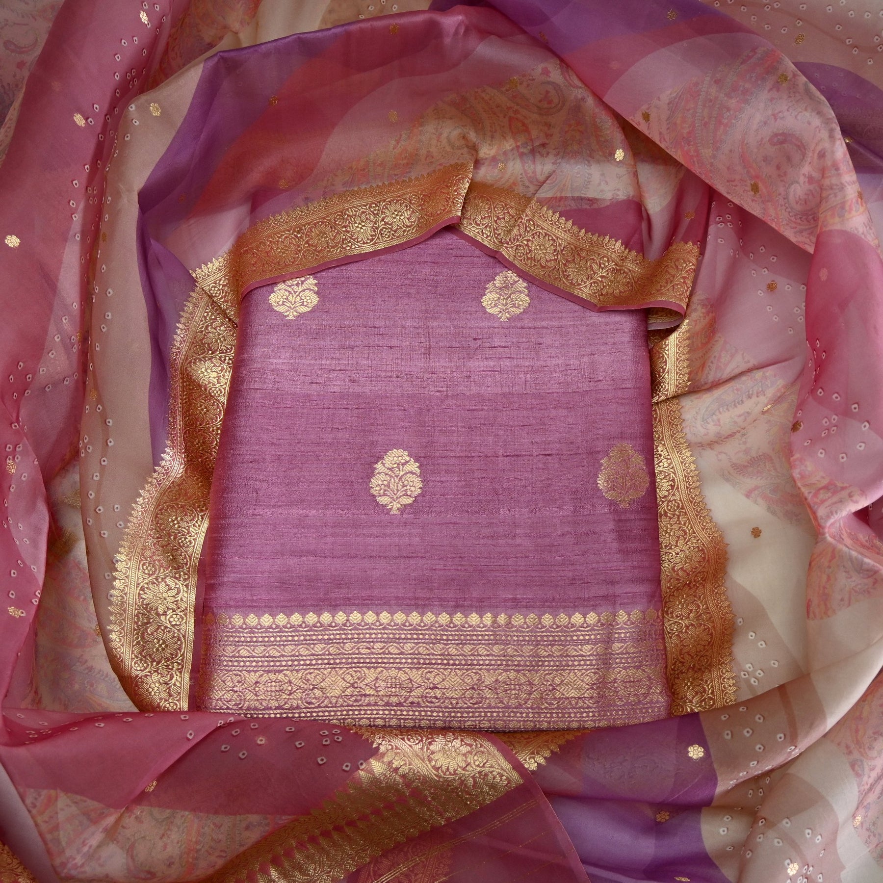 Elevate your festive style with this Pure Dupion Silk Unstitched Suit Set, featuring elegant Banarasi Zari Booti work that adds a rich traditional touch. The set includes a soft Organza Dupatta and a matching Dupion Silk bottom, offering a luxurious, coordinated look. Ideal for weddings, festive occasions, and parties.