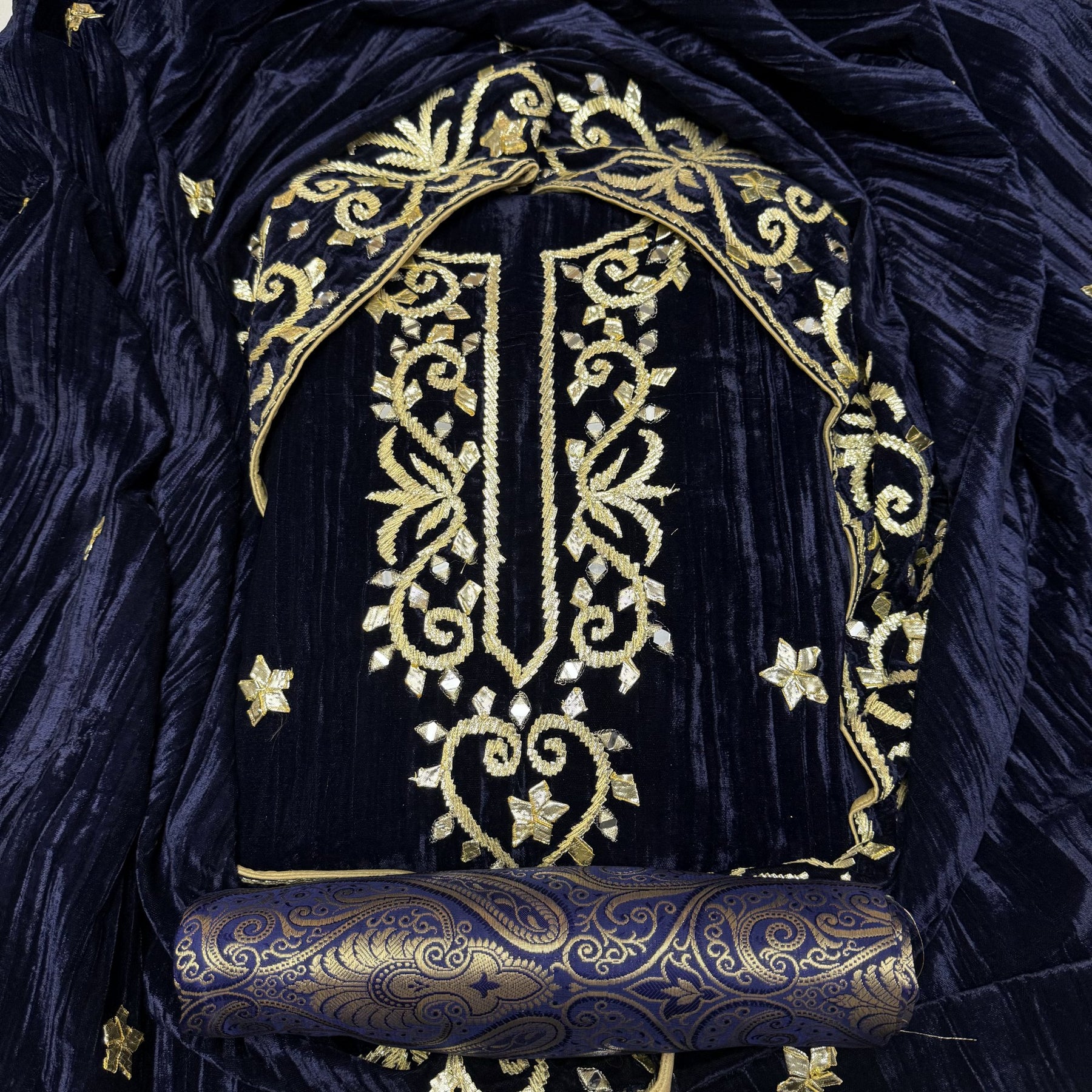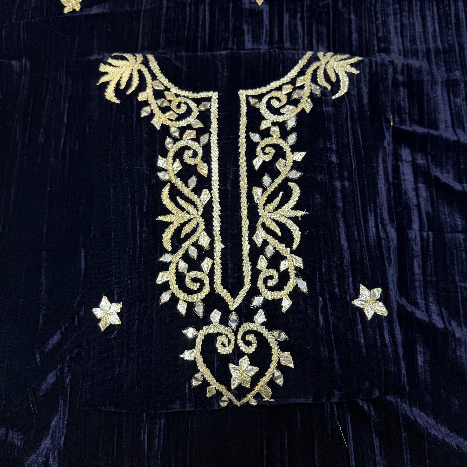 This elegant unstitched suit set is crafted from pure silk velvet, offering a luxurious shine and rich texture. The top features beautiful Gota Patti work paired with delicate mirror embellishments, giving it a festive and royal look.