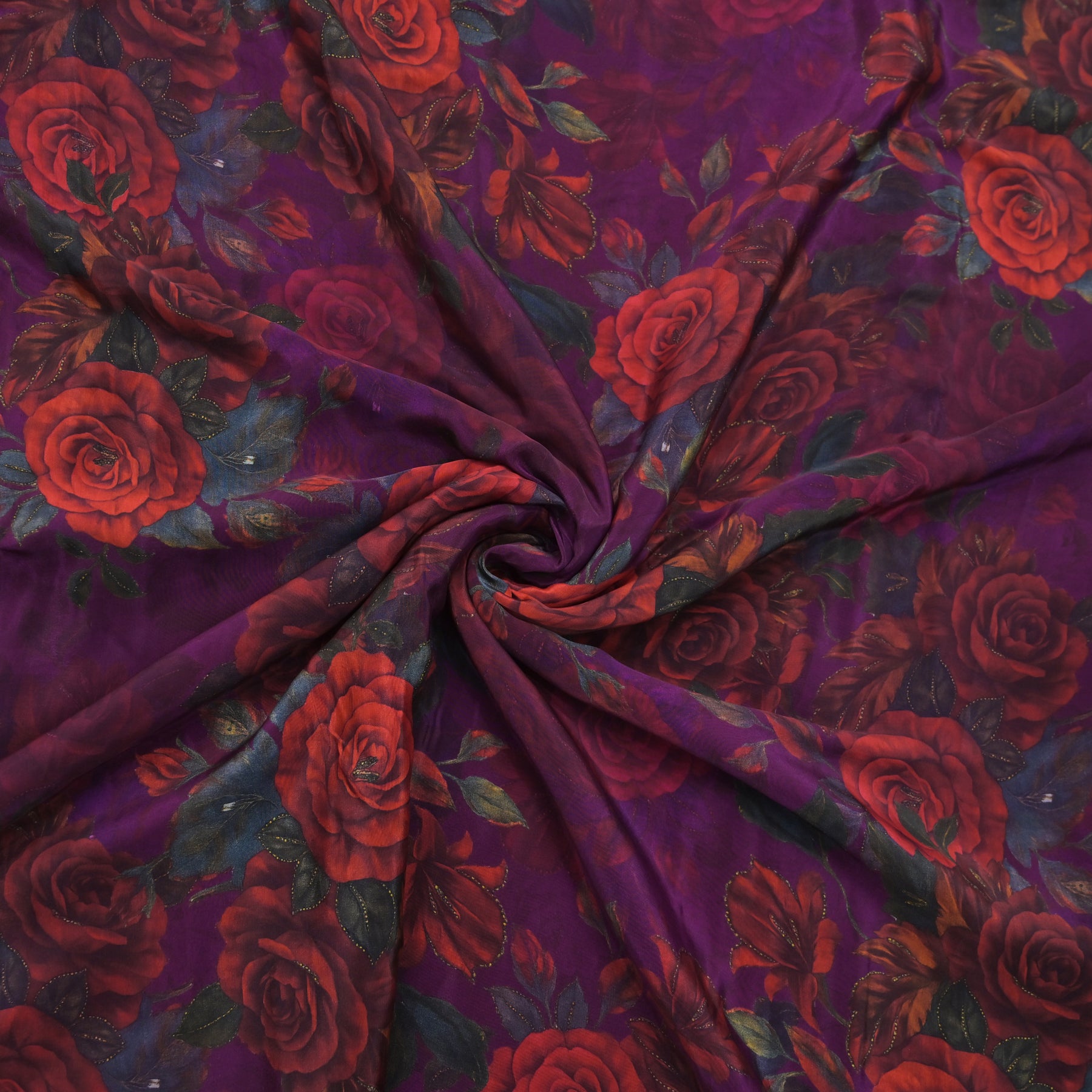 This elegant crepe fabric features a rich, deep Purple base adorned with clusters of blooming roses in vibrant shades of magenta, red, fuchsia, and soft lavender. The floral arrangements are detailed with dark green foliage, creating a striking contrast against the bold background. The print has a soft, painterly quality, giving the fabric a luxurious and artistic feel. Ideal for dresses, sarees, blouses, and statement garments, this fabric combines sophistication with a touch of dramatic flair, making it perfect for both festive and evening wear.