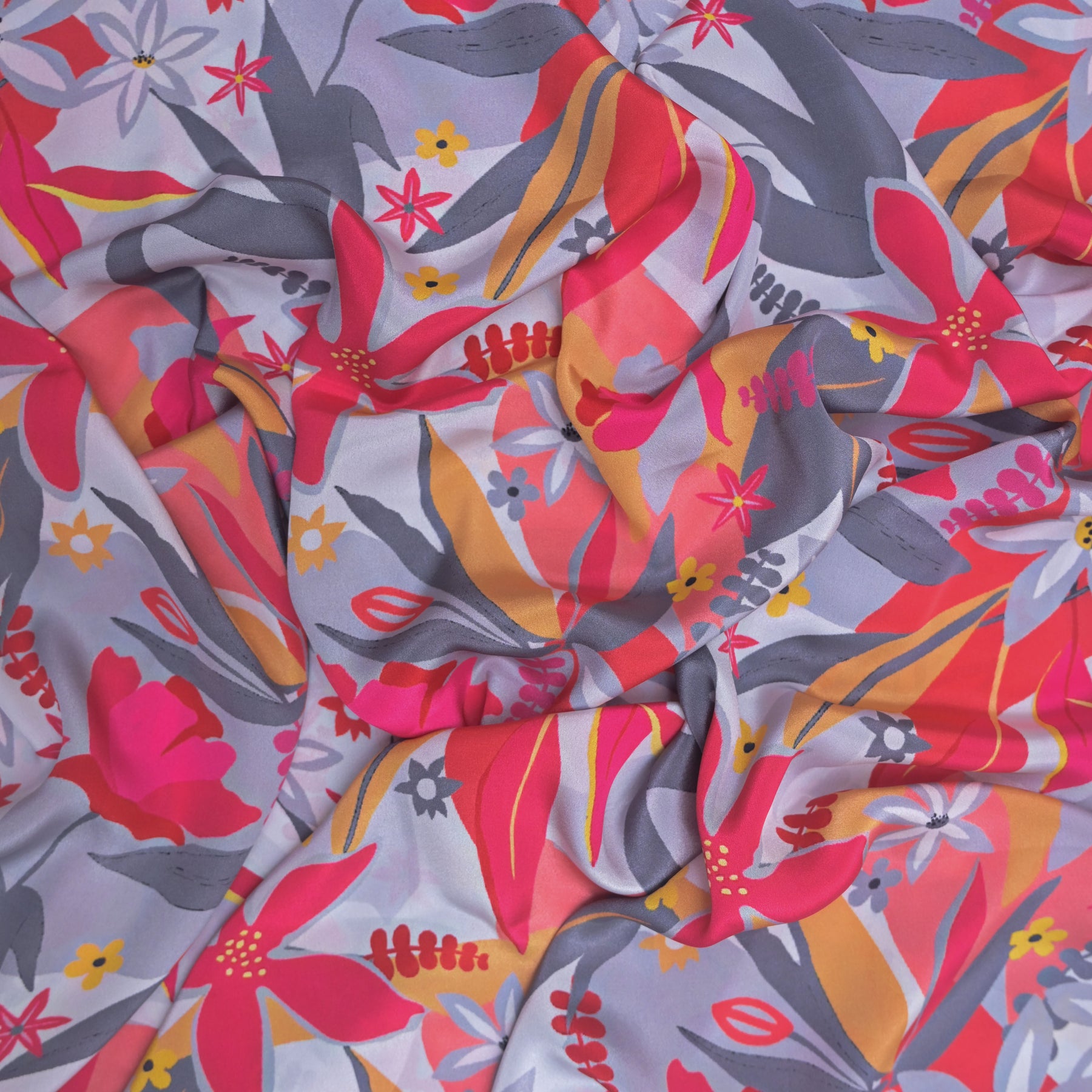It is a lightweight, flowy textile crafted with a crepe weave and adorned with Red & Grey Floral print using digital printing techniques. These fabrics combine artistic, high-resolution patterns with the classic texture of crepe, making them versatile and stylish for fashion applications.