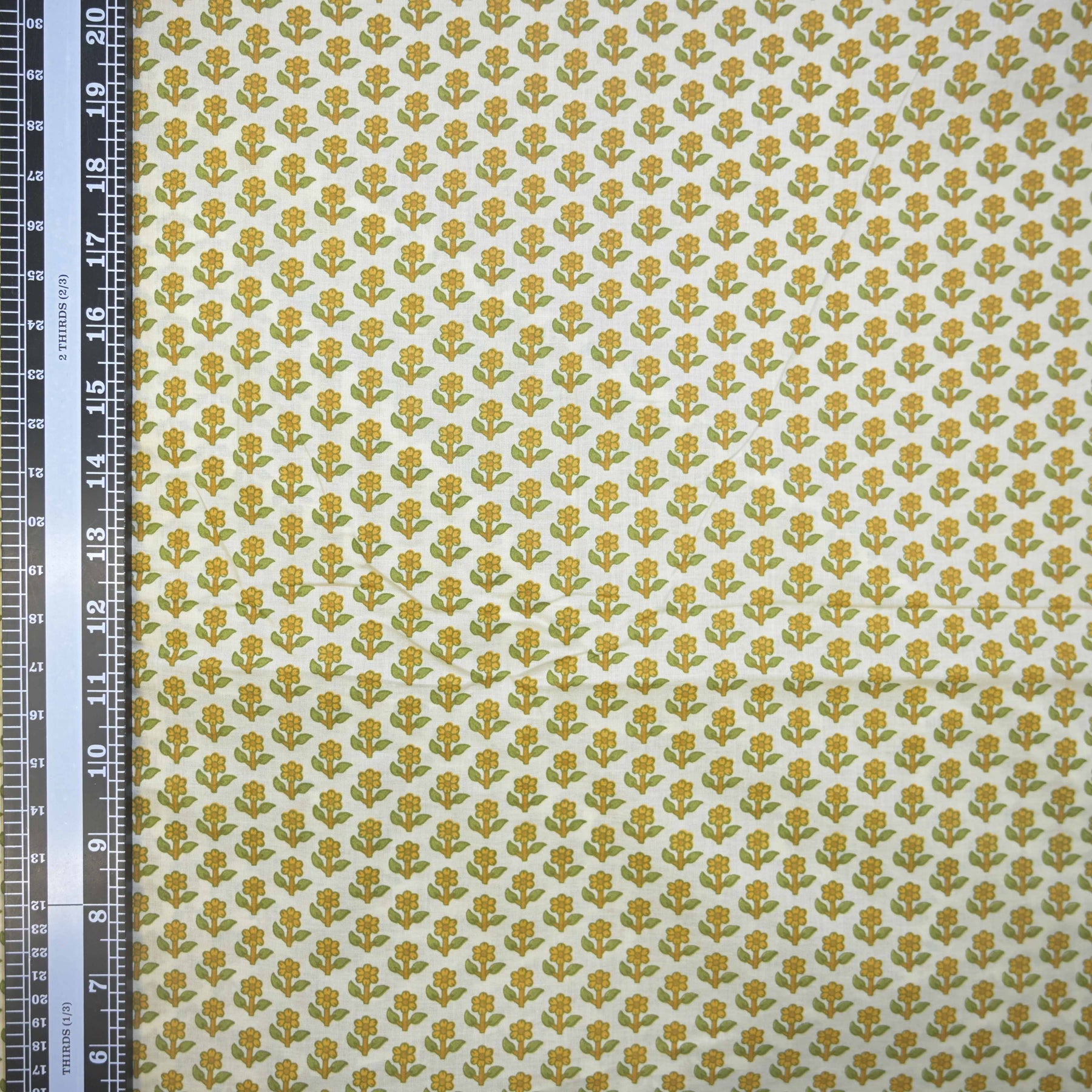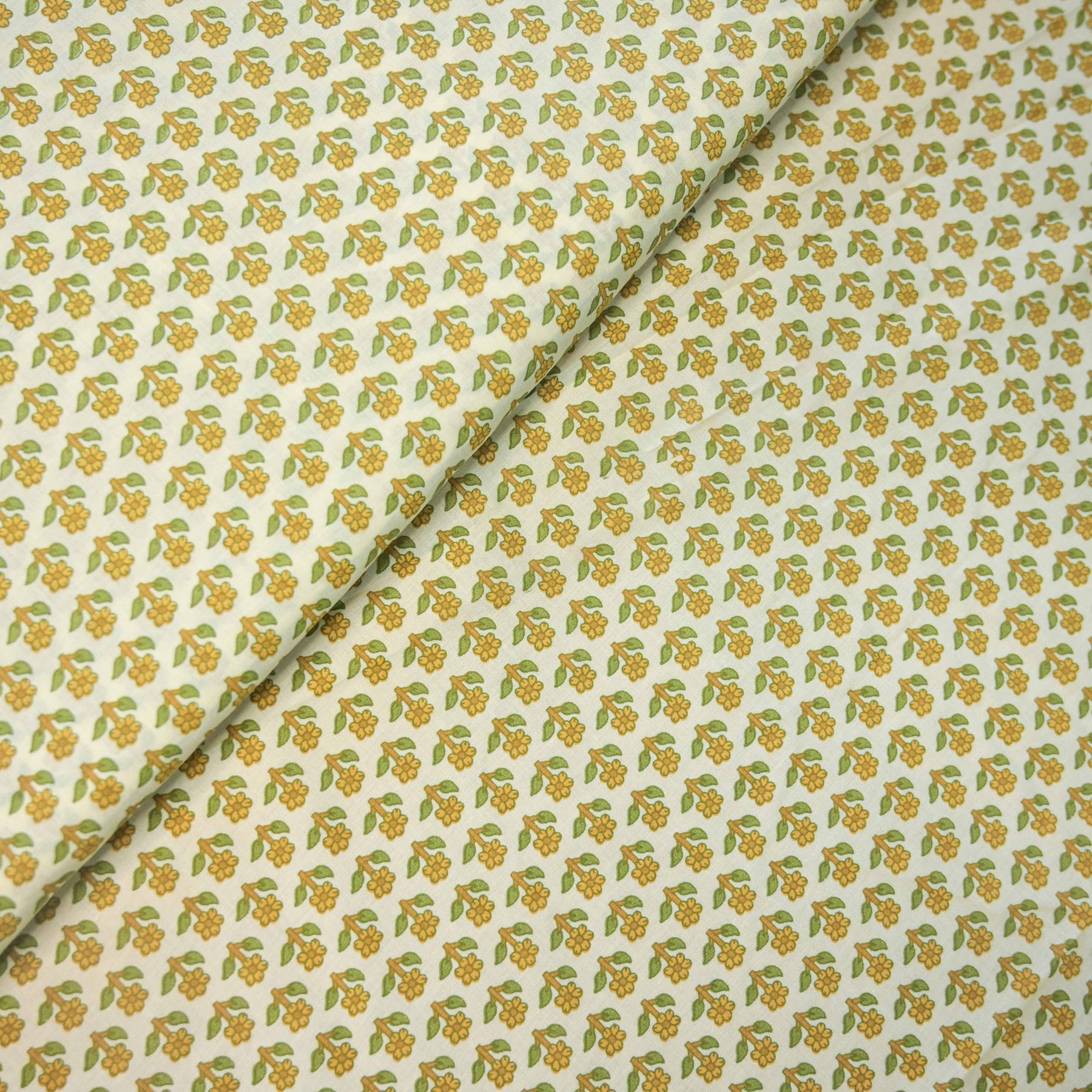 Subtle, graceful, and endlessly wearable, this Lemon Yellow Mini Floral Buti Printed Cotton Fabric features a soft cream base highlighted with finely spaced floral butis in muted Beige and green tone. Ideal for everyday elegance with a handcrafted feel.