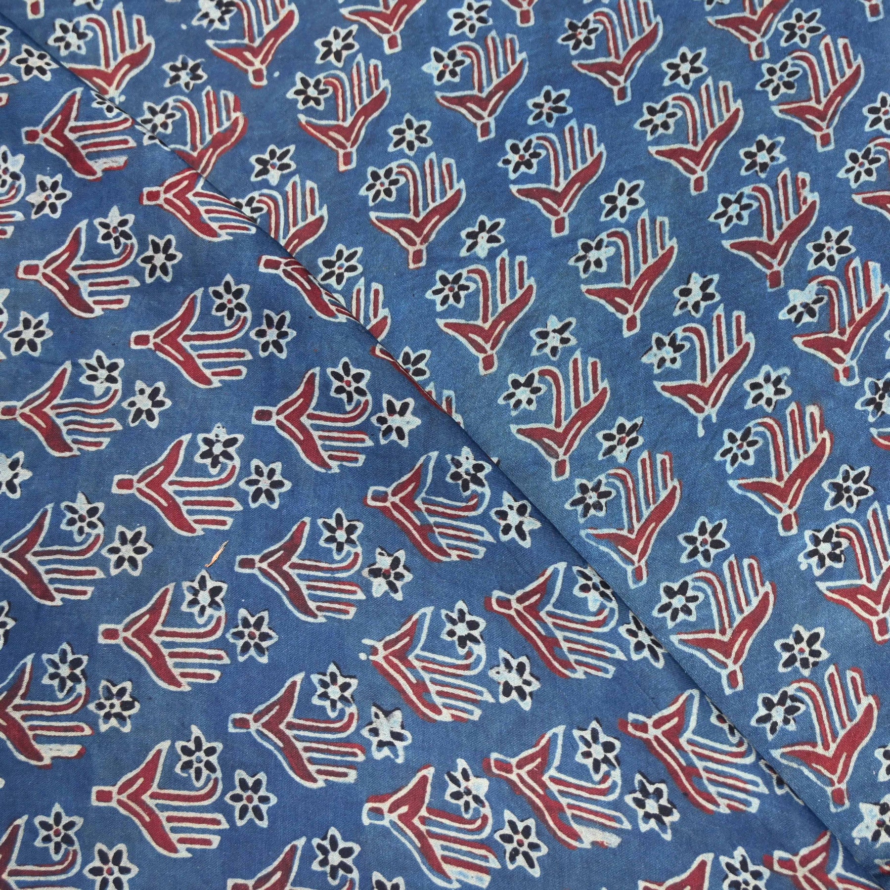 This fabric features a rich indigo-blue background adorned with a repeating hand-block style motif. The primary design consists of stylized floral or tulip-like forms printed in deep red and white, with delicate outlining that gives a handcrafted feel. Scattered between the larger motifs are small, simple white floral accents with dark centers, adding balance and charm to the pattern.