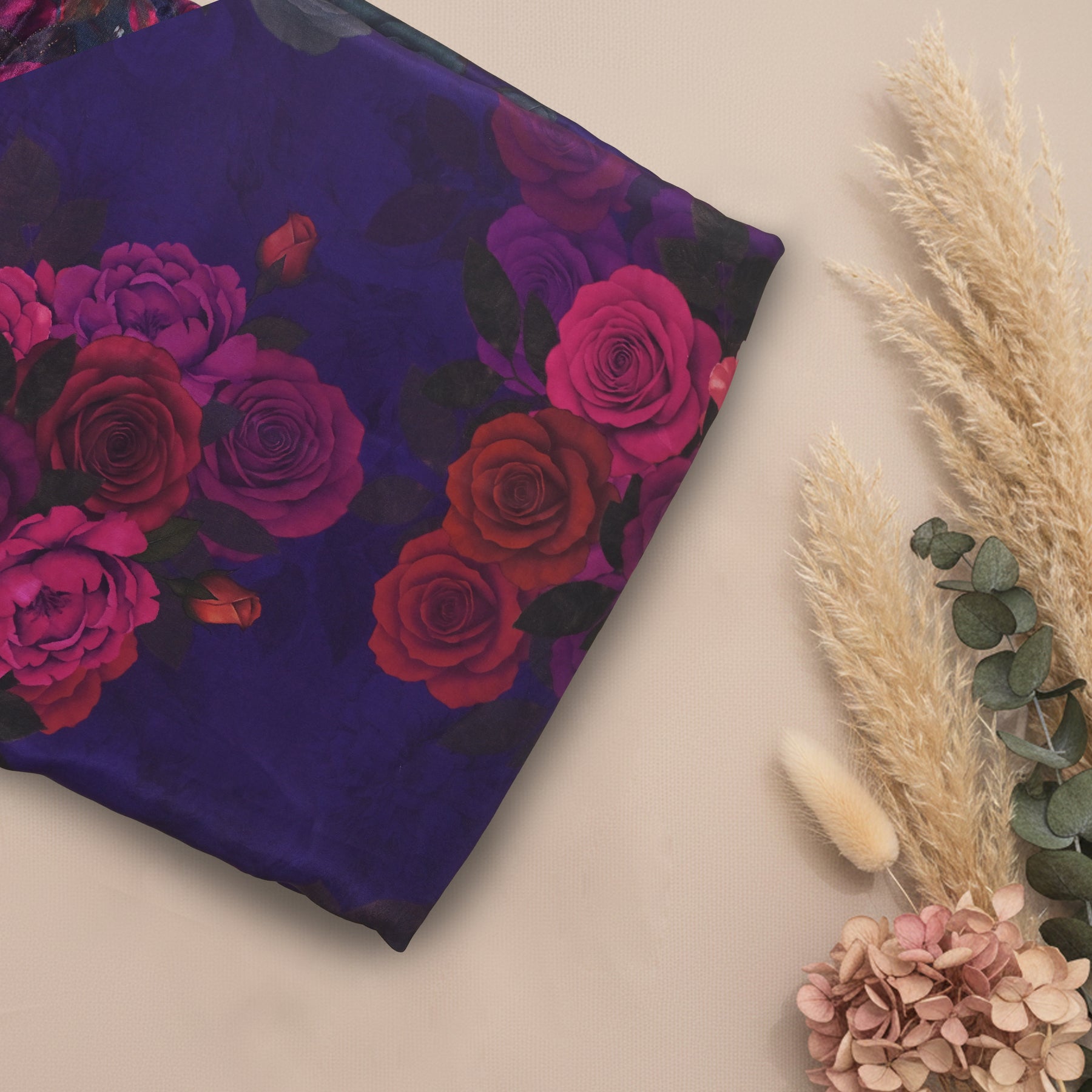 This elegant crepe fabric features a rich, deep violet base adorned with clusters of blooming roses in vibrant shades of magenta, red, fuchsia, and soft lavender. The floral arrangements are detailed creating a striking contrast against the bold background. The print has a soft, painterly quality, giving the fabric a luxurious and artistic feel. Ideal for dresses, sarees, blouses, and statement garments, this fabric combines sophistication with a touch of dramatic flair, making it perfect for both festive and evening wear.