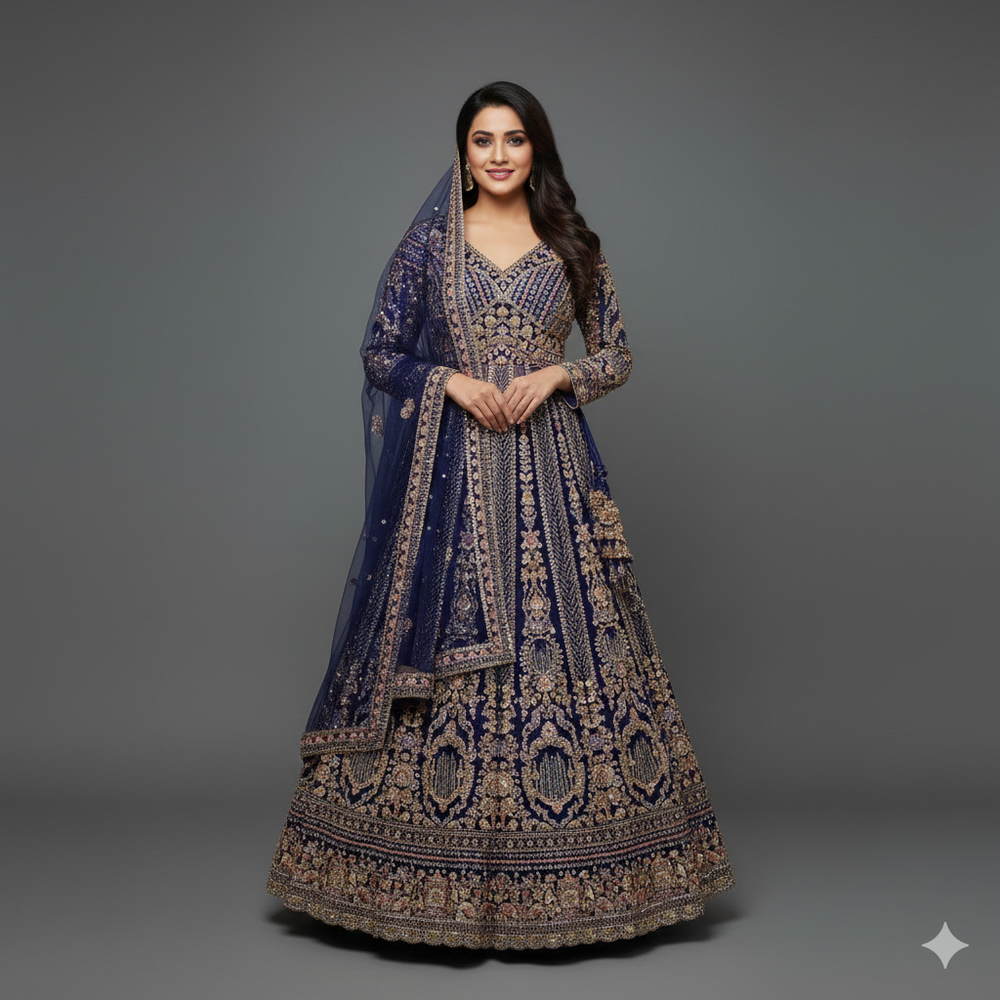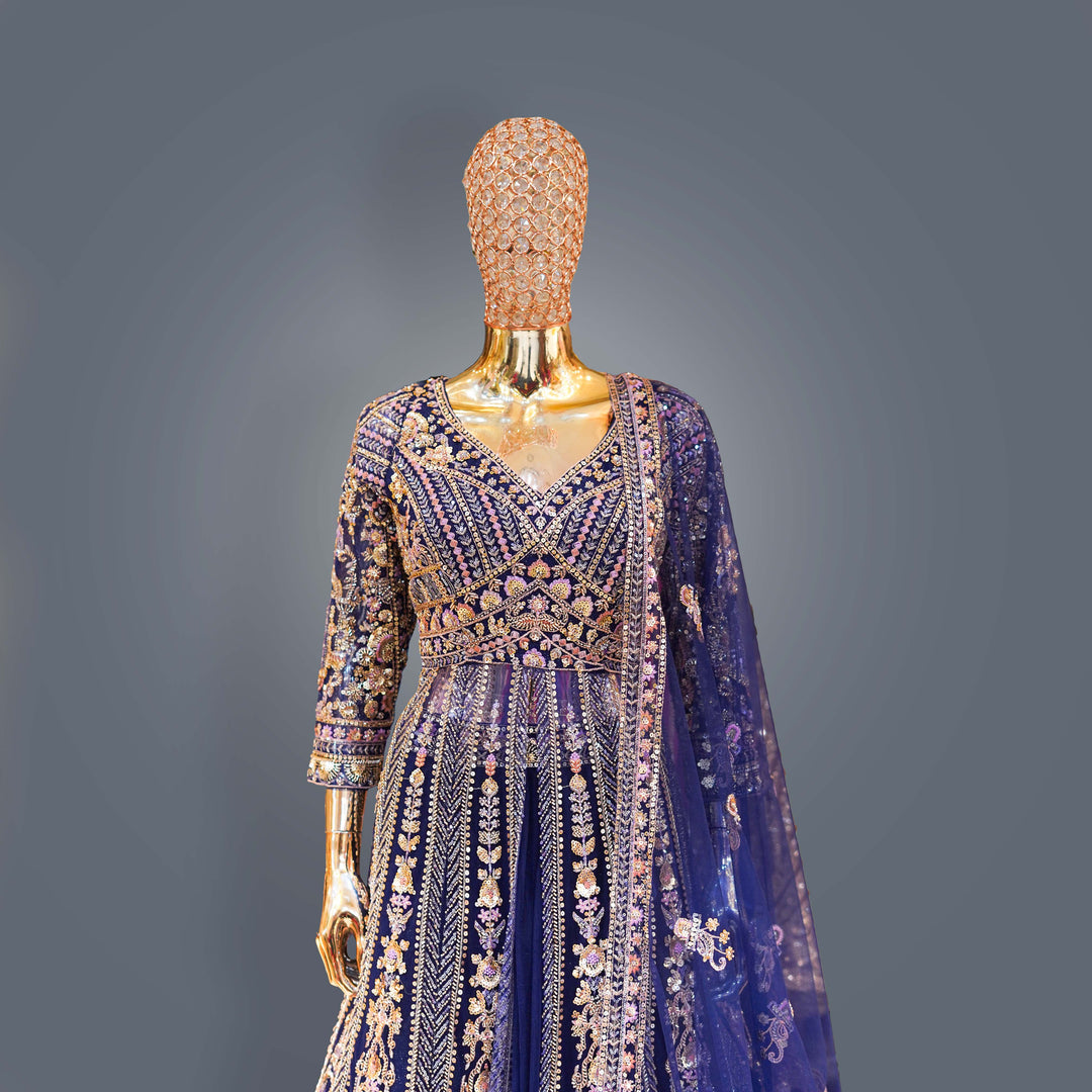 Royal Indigo Farshi Lehenga Set with Heavy Zari, Cutdana and Hand Embroidery