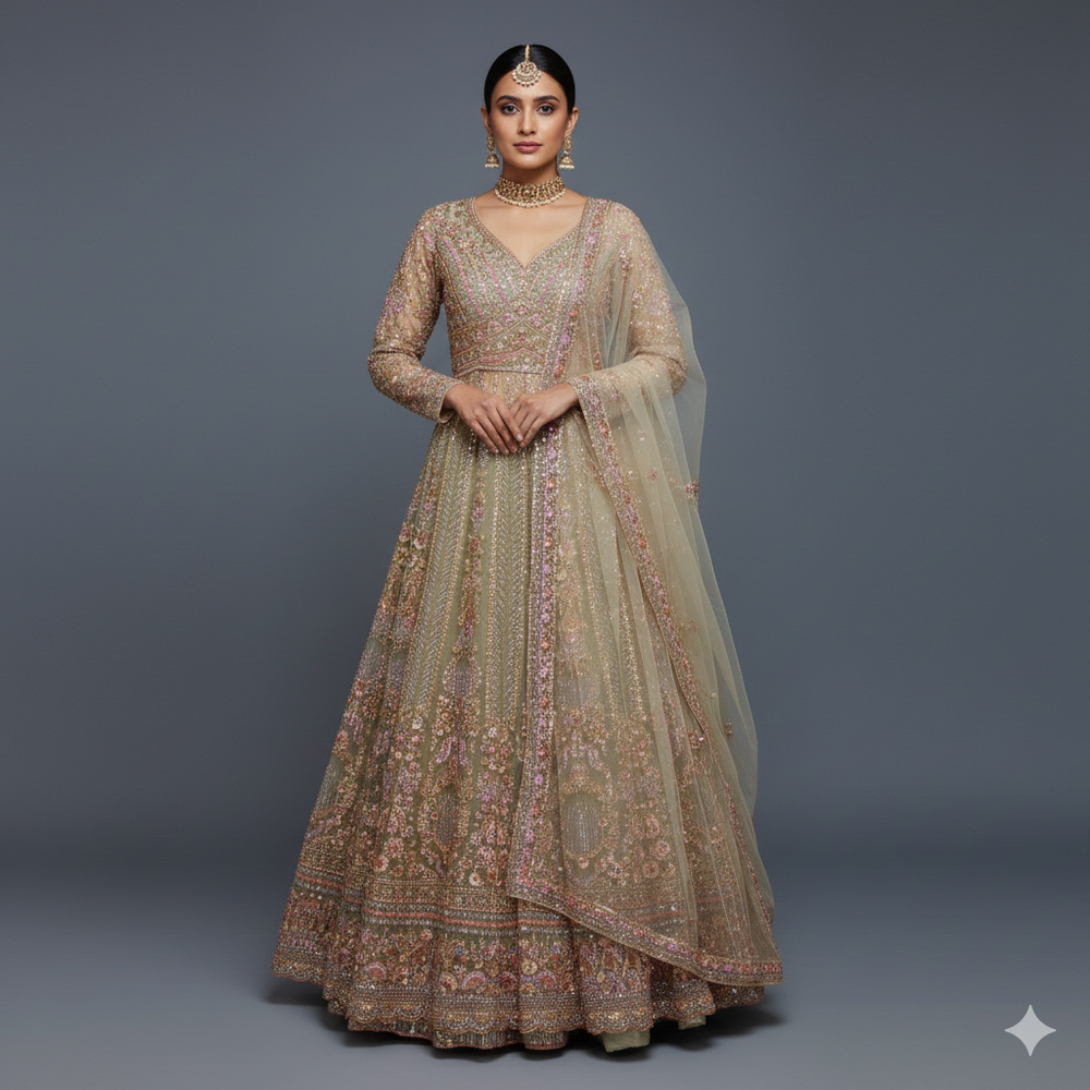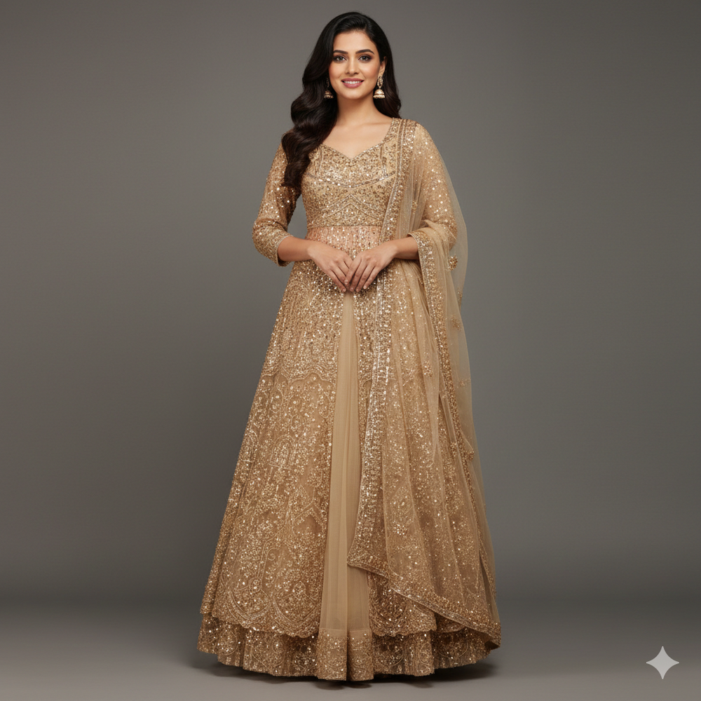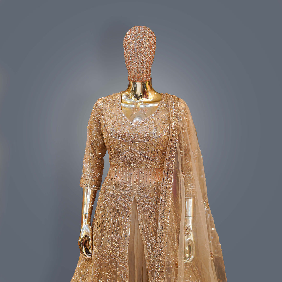 Metallic Beige Bridal Lehenga Dress with Heavy Zari, Sequins and Hand Embroidery