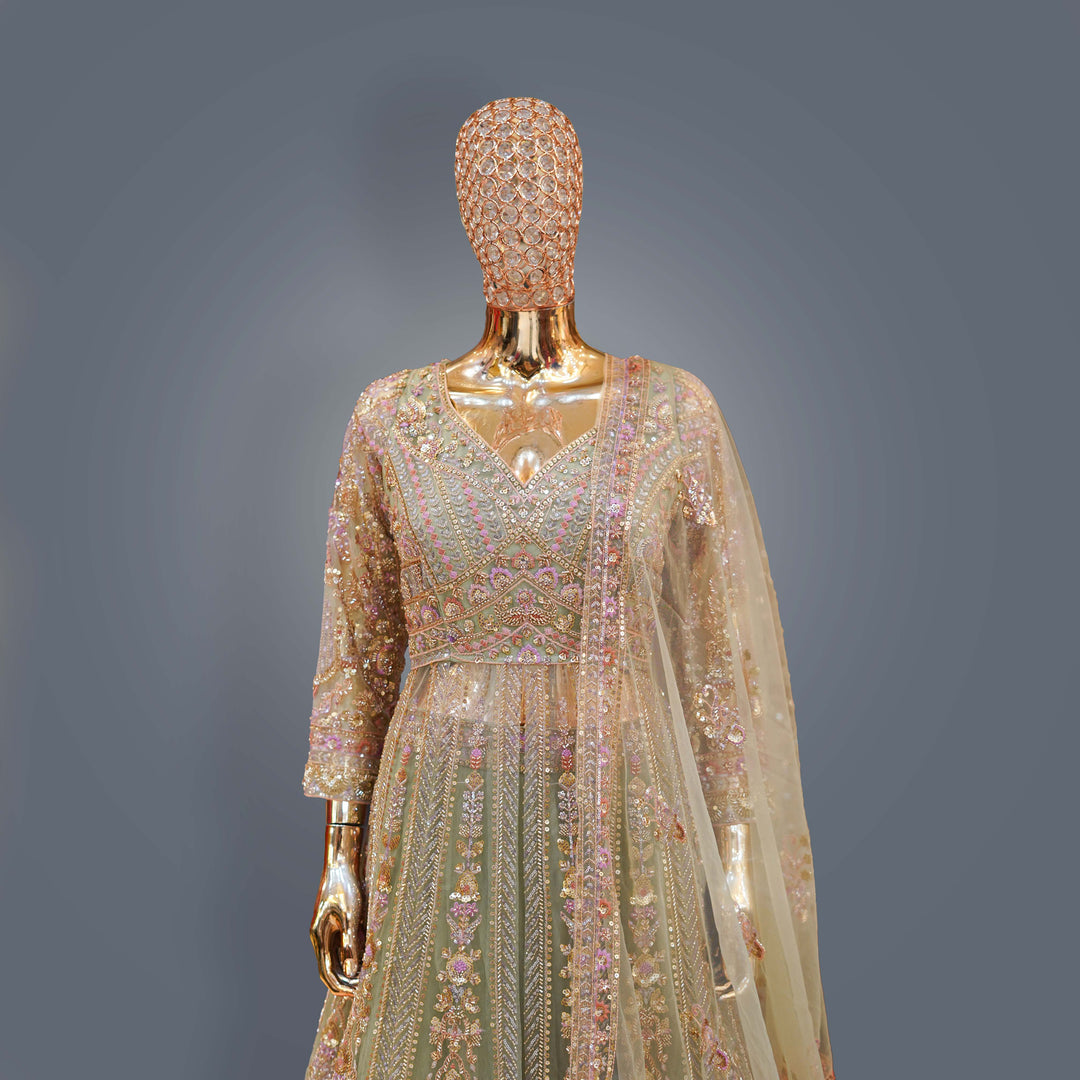 Pastel Pistachio Bridal Lehenga Dress with Heavy Zari, Cutdana and Hand Embroidery