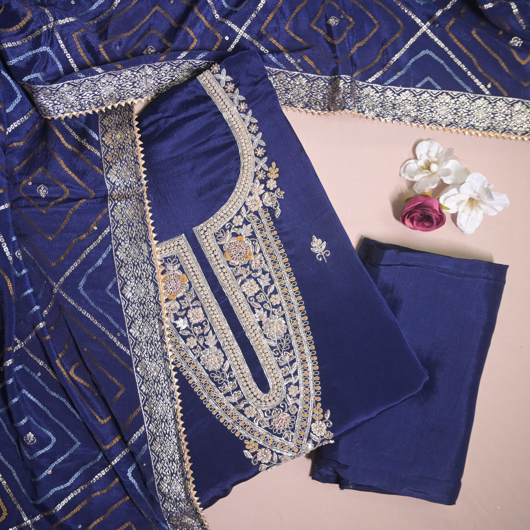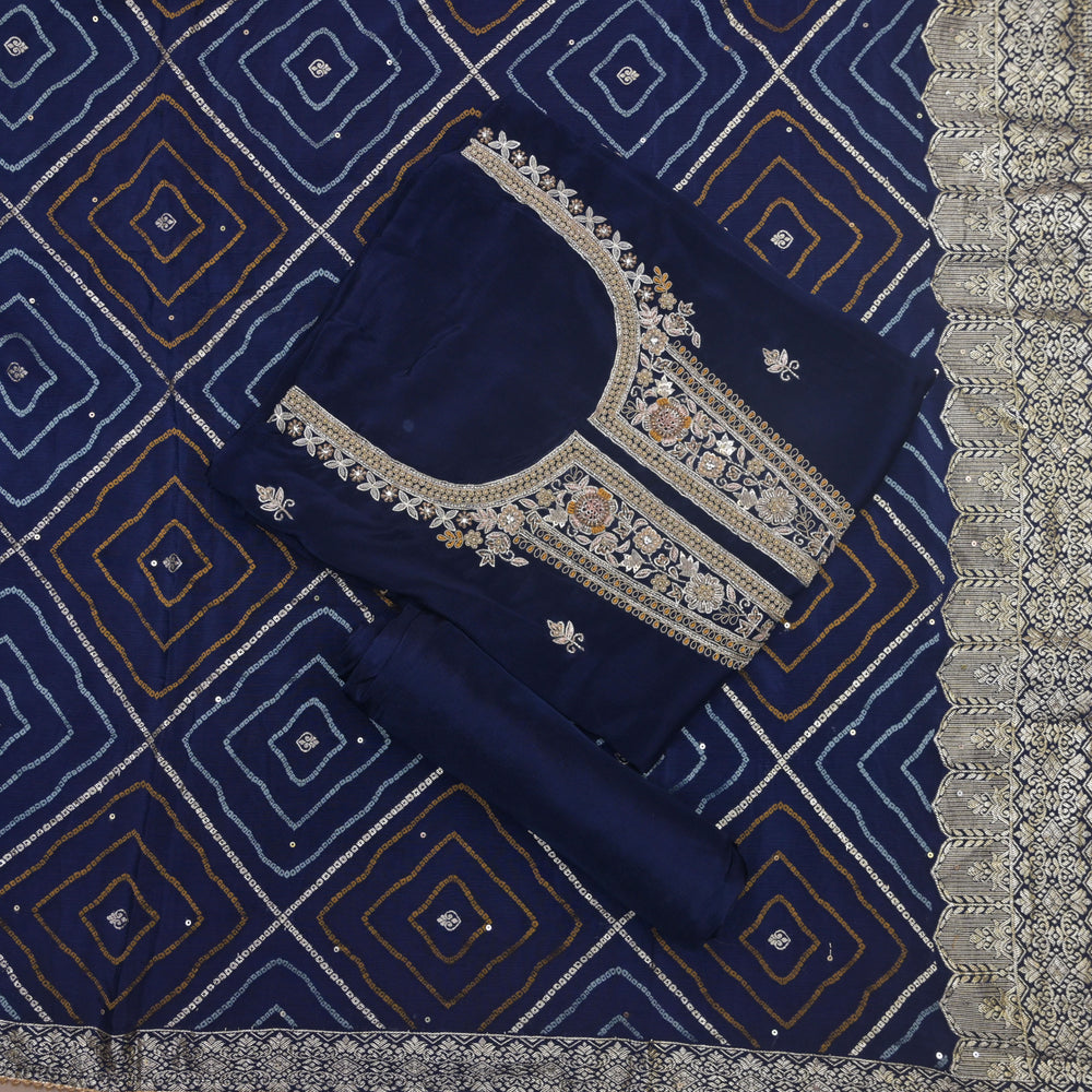 Dark Blue Banarasi Silk Unstitched Suit Set
