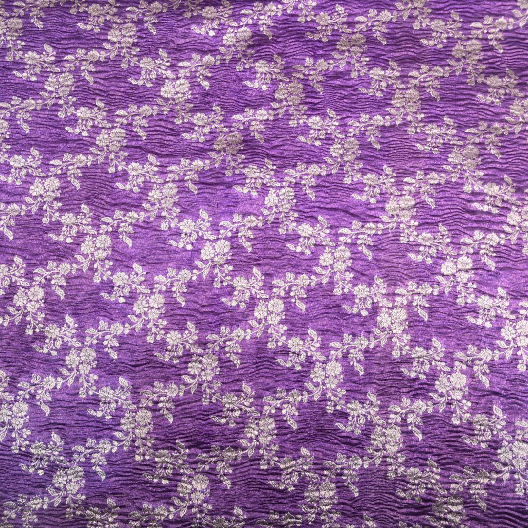 Exude regal elegance with this Royal Purple Pure Crush Tissue fabric, exquisitely highlighted with an all-over zari jaal. Crafted from luxurious pure crush tissue, the fabric features a distinctive crinkled texture that enhances its rich sheen and fluid drape, creating a striking visual appeal.
