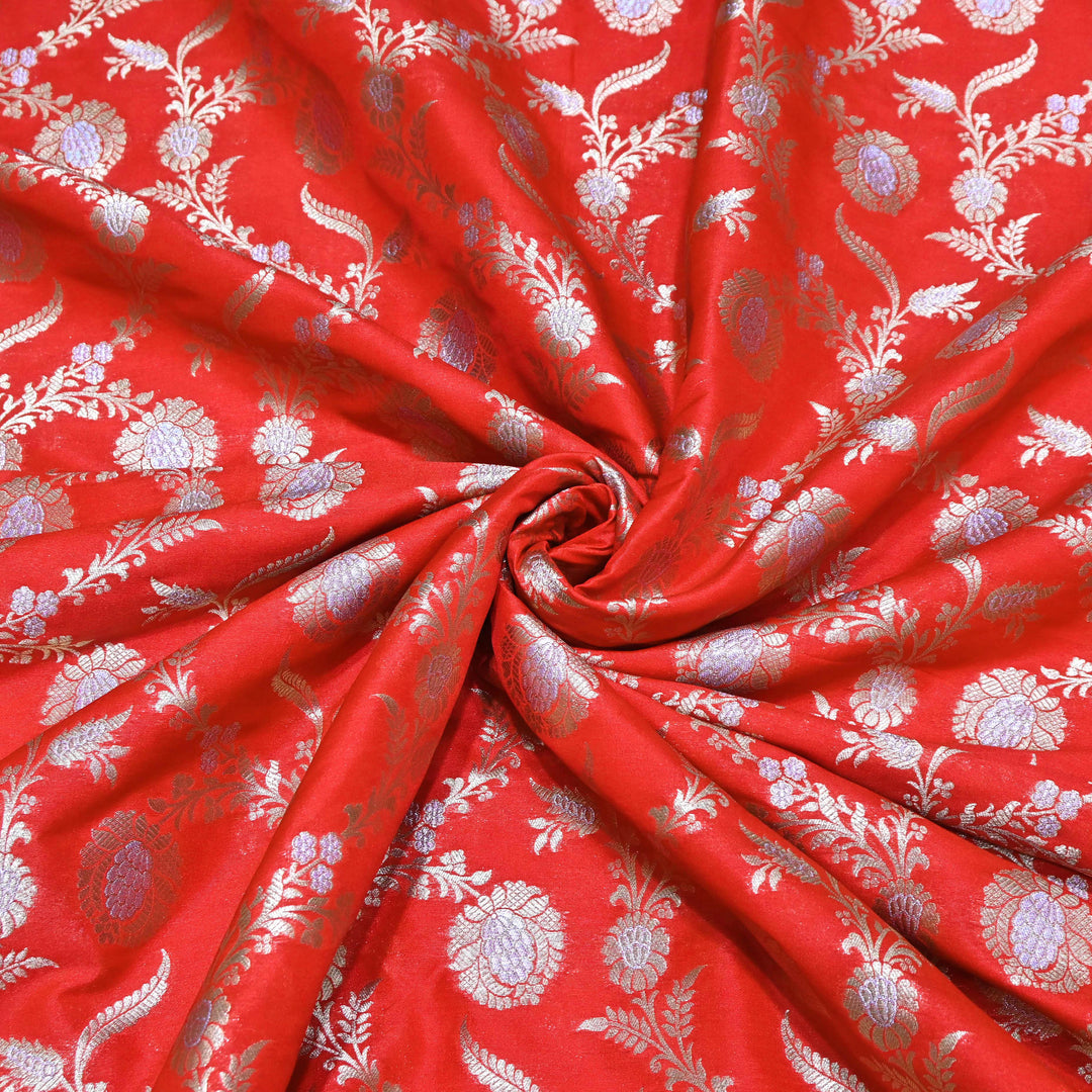 Vermilion Red & Silver Zari Floral Brocade Fabric.