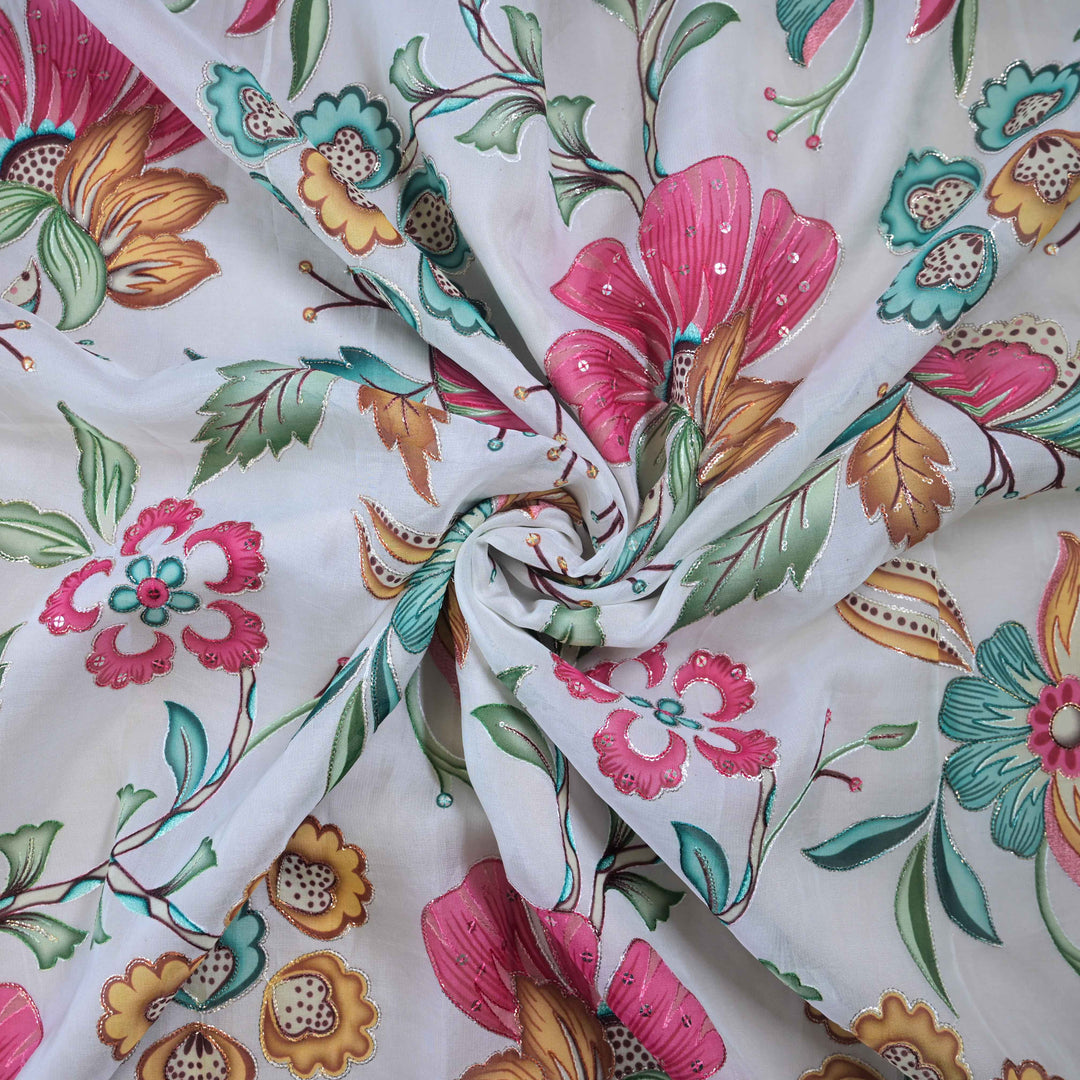 White Georgette Dyeable Fabric with allover Zari & Sequins Embroidery