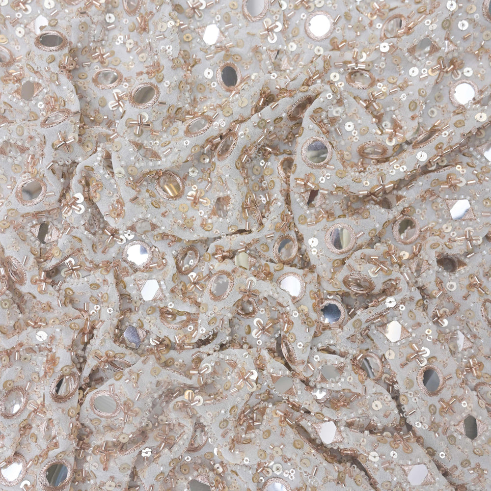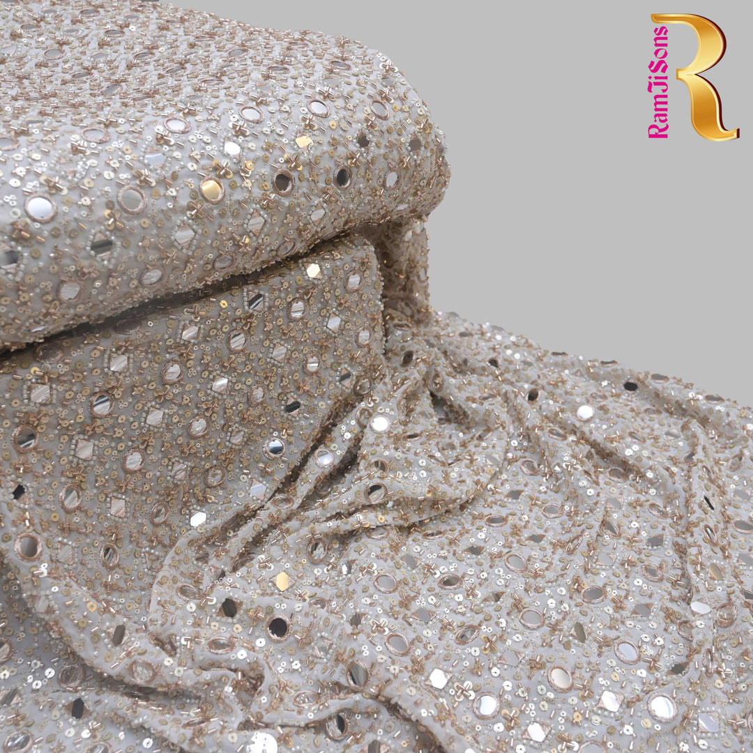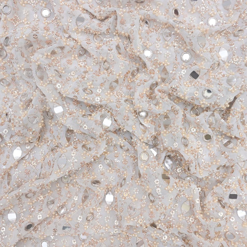 White Georgette Fabric with allover Mirrorwork, Beadwork & Sequins | 54642