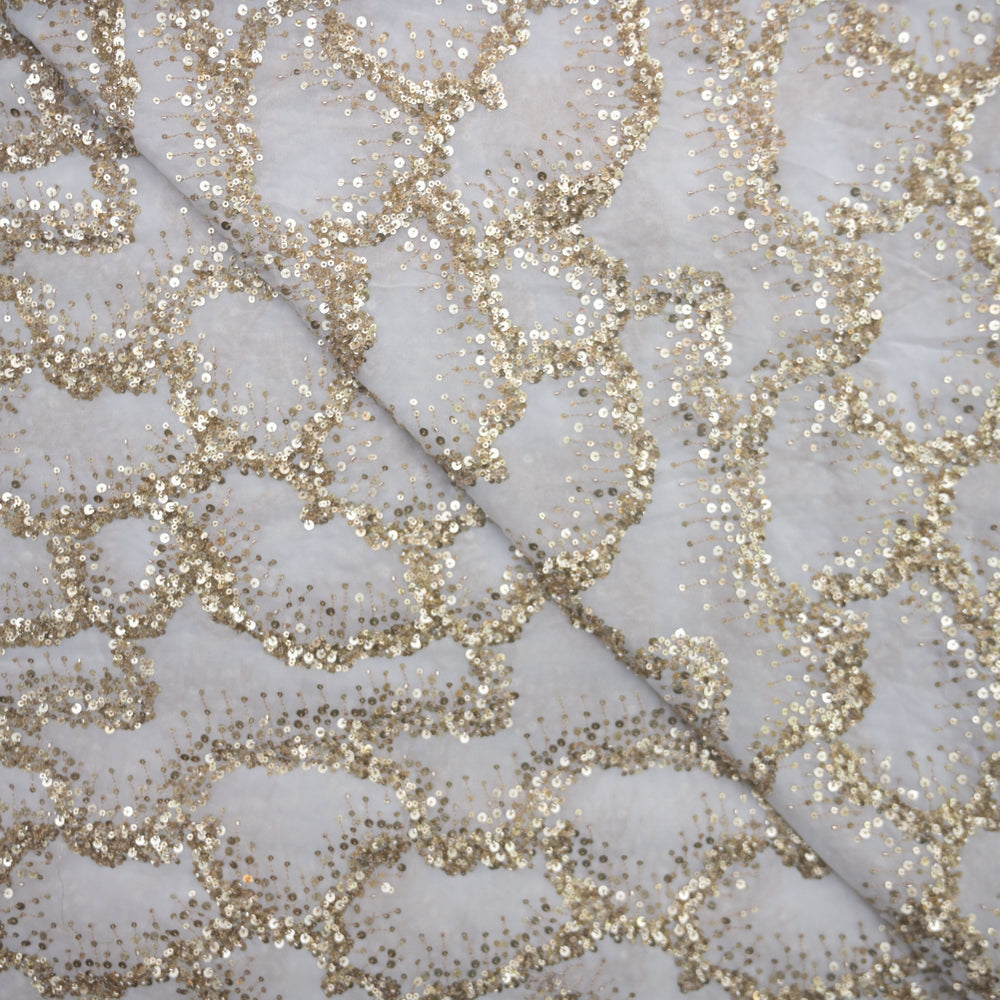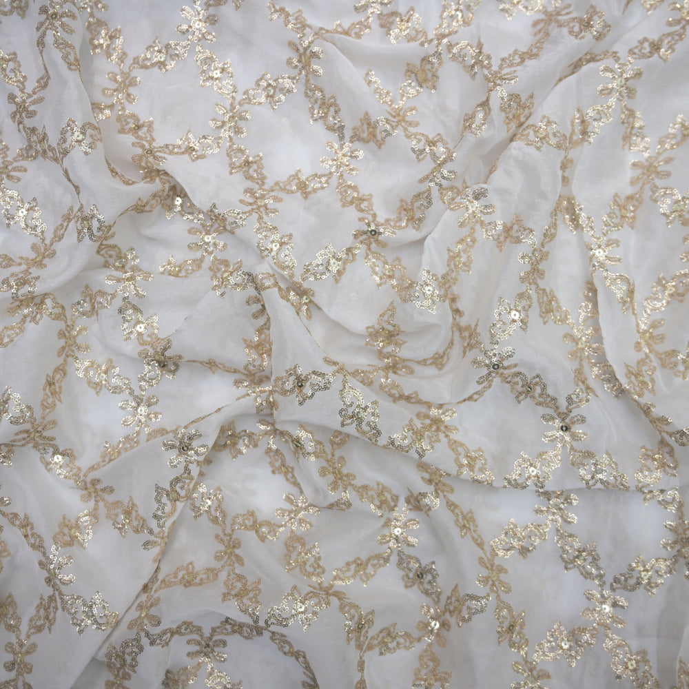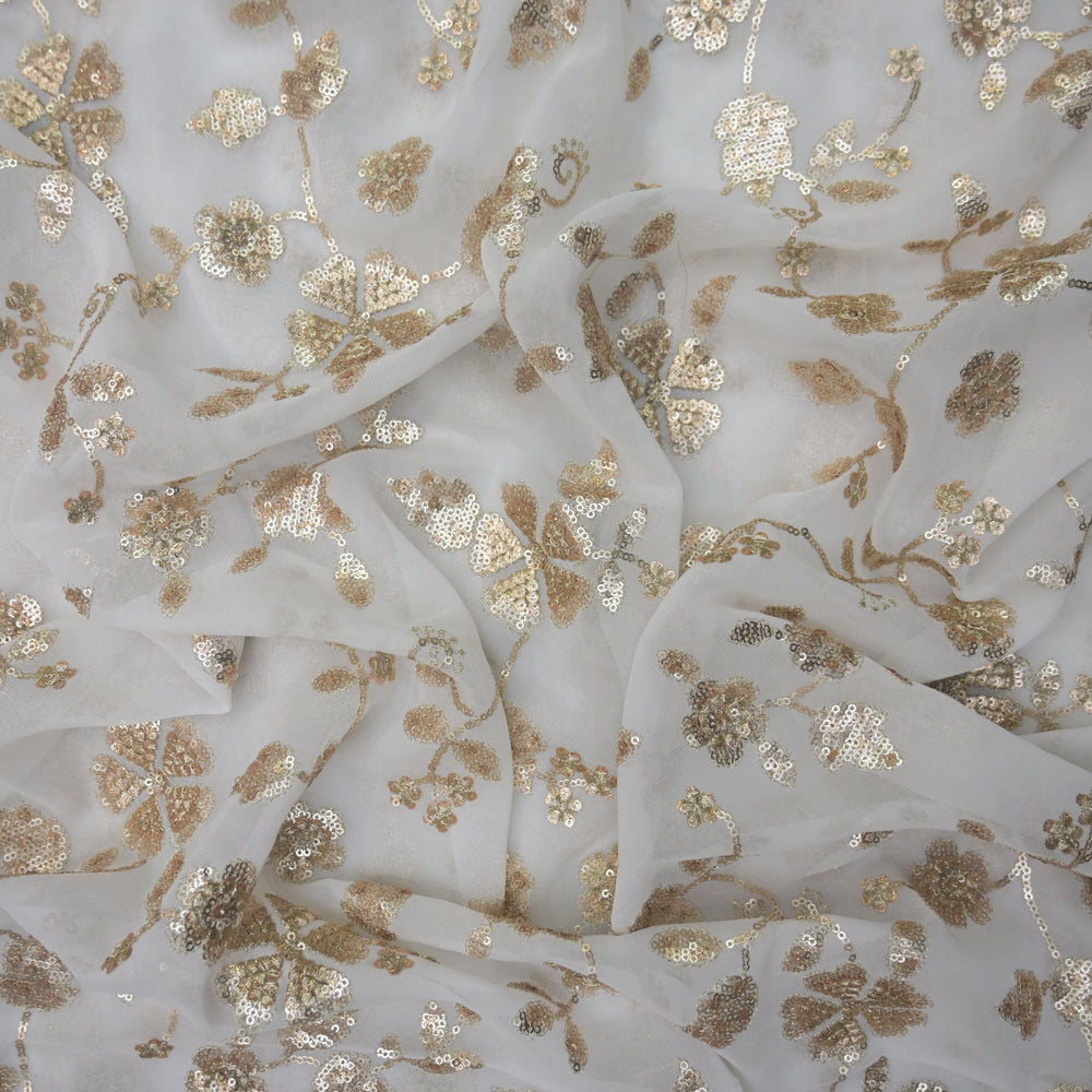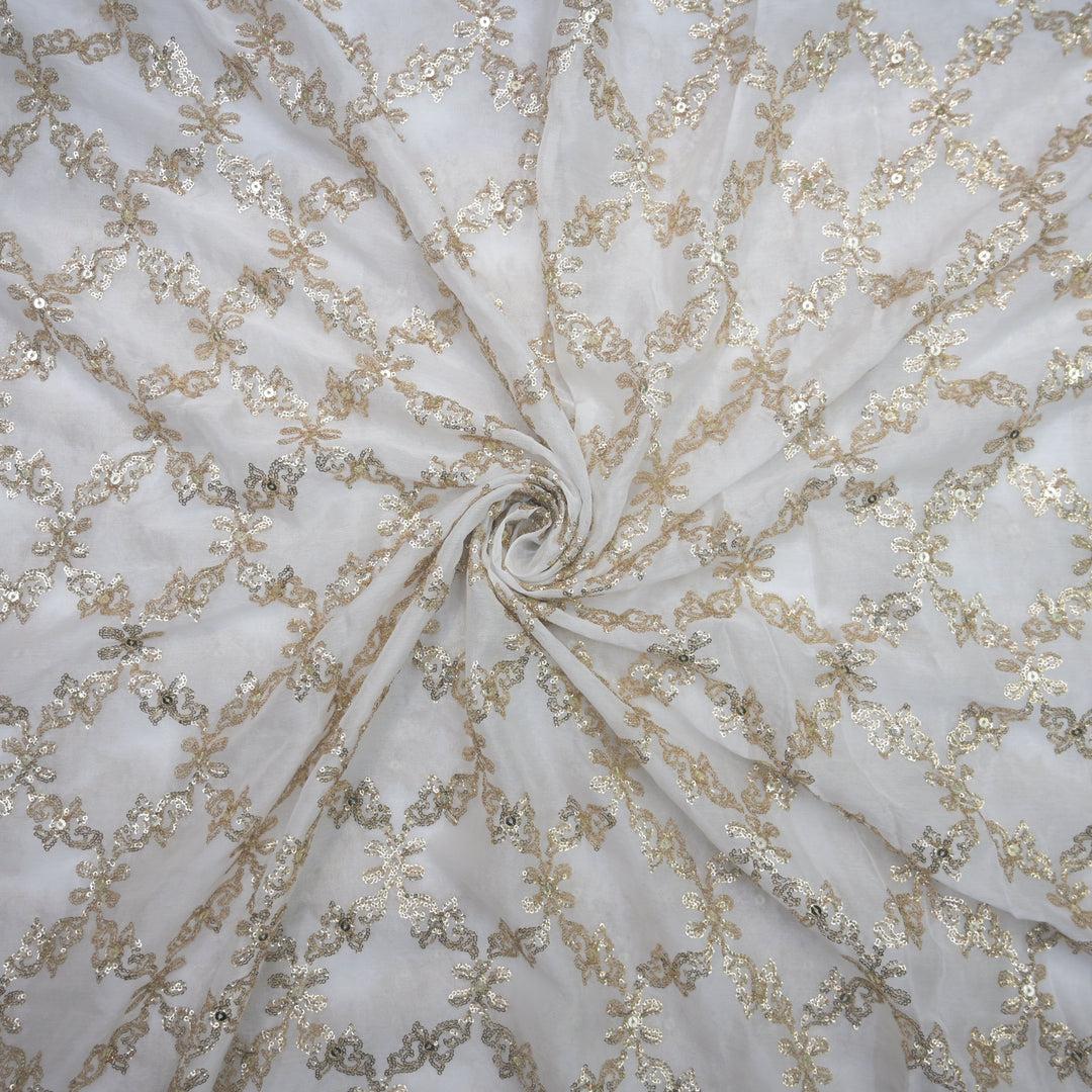 White Gold Georgette Dyeable Fabric with allover Gold Zari & Sequins Embroidery