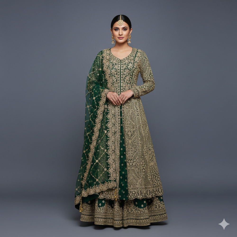 Bottle Green Designer Bridal Lehenga Dress with Heavy Zari, Cutdana and Hand Embroidery