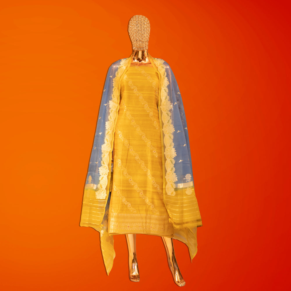 Step into timeless elegance with our Pure Raw Silk Banarasi Zari Unstitched Suit Set, a masterpiece that brings together rich tradition and refined sophistication.