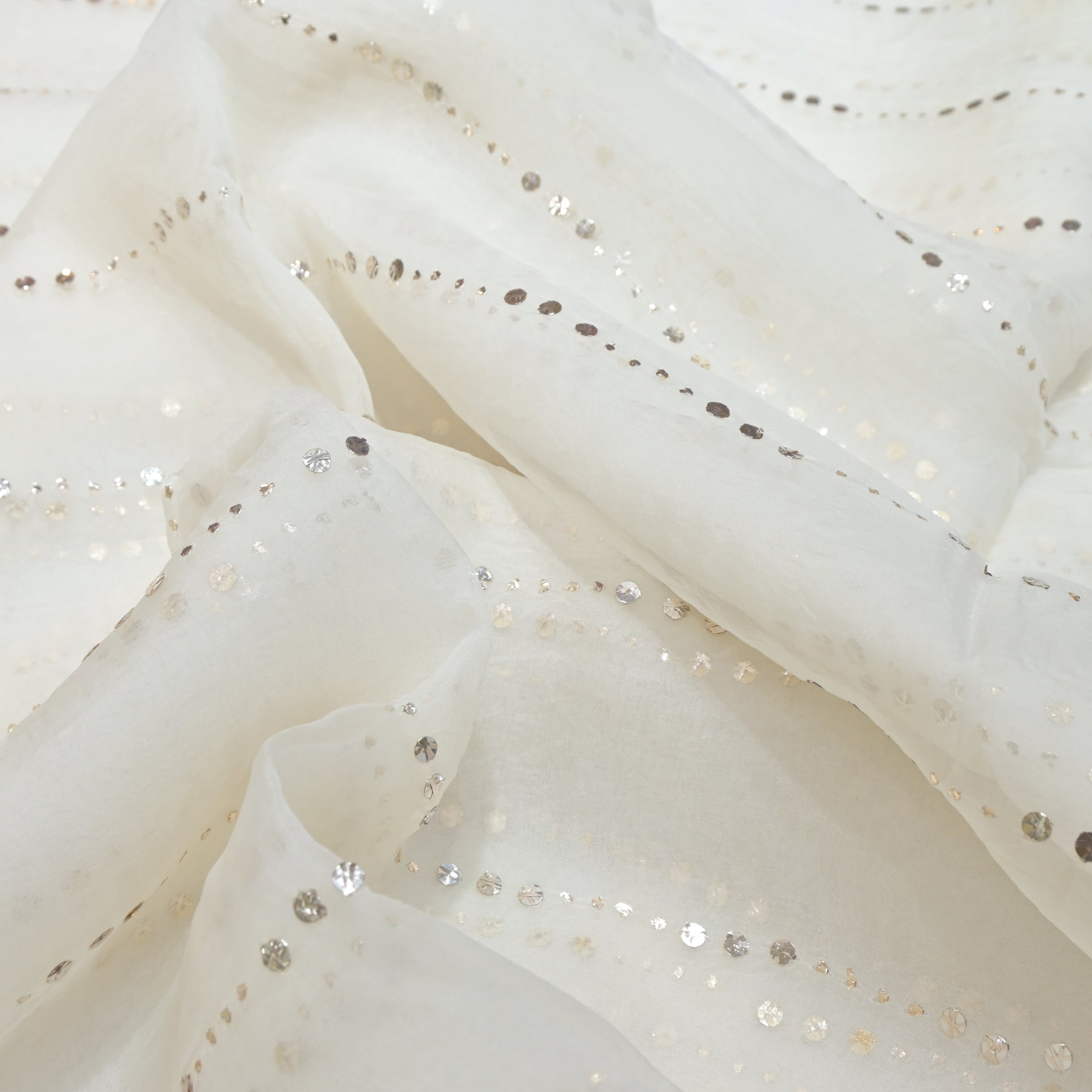 Elevate your wardrobe with our 28gm Organza Fabric, delicately adorned with traditional Mukaish Handwork. Lightweight yet structured, this fine organza offers a crisp texture with a subtle natural sheen that enhances its luxurious appeal.