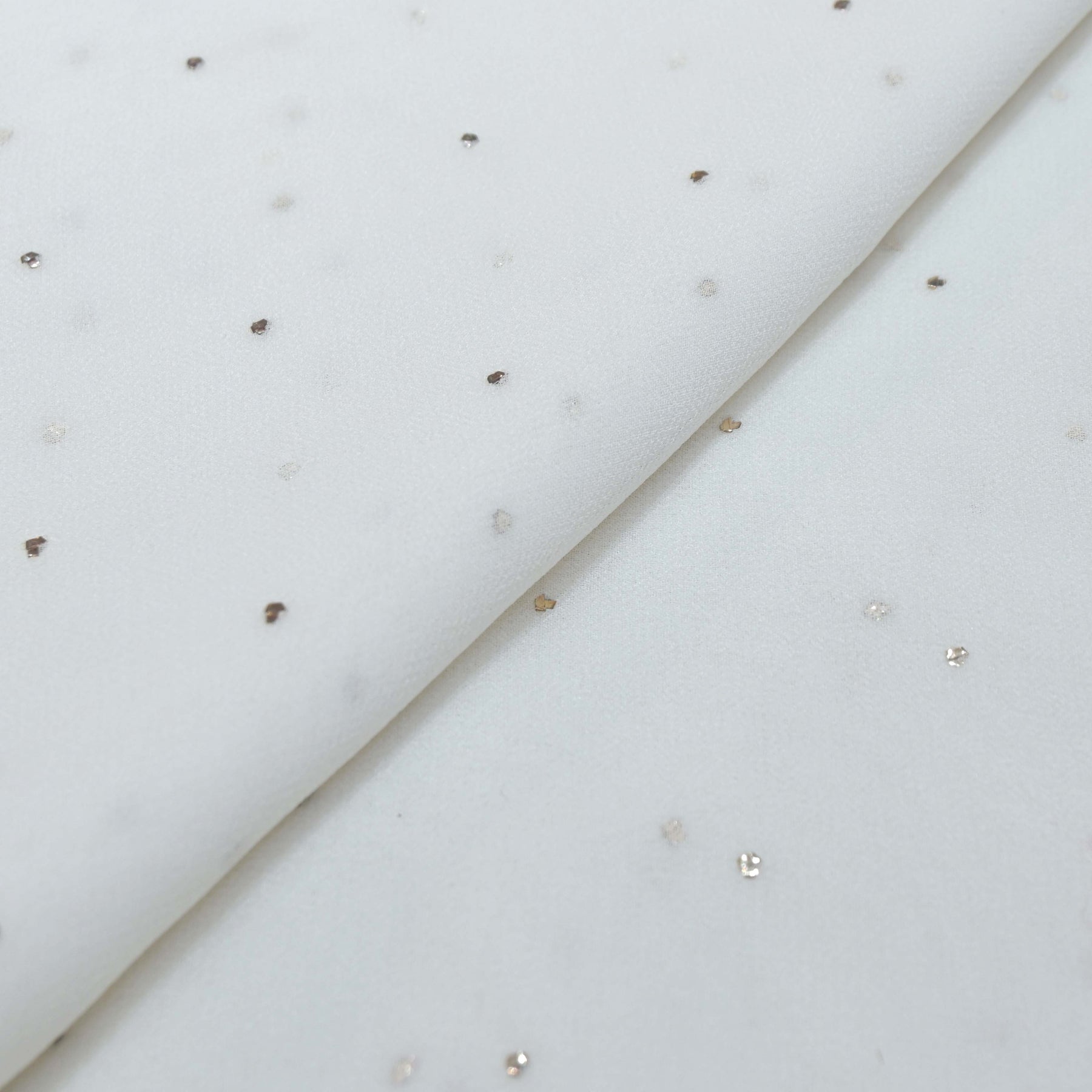RAMJISONS Elevate your wardrobe with our 60gm Georgette Fabric, delicately adorned with traditional Mukaish Handwork. Lightweight yet structured, this fine georgette offers a crisp texture with a subtle natural sheen that enhances its luxurious appeal.