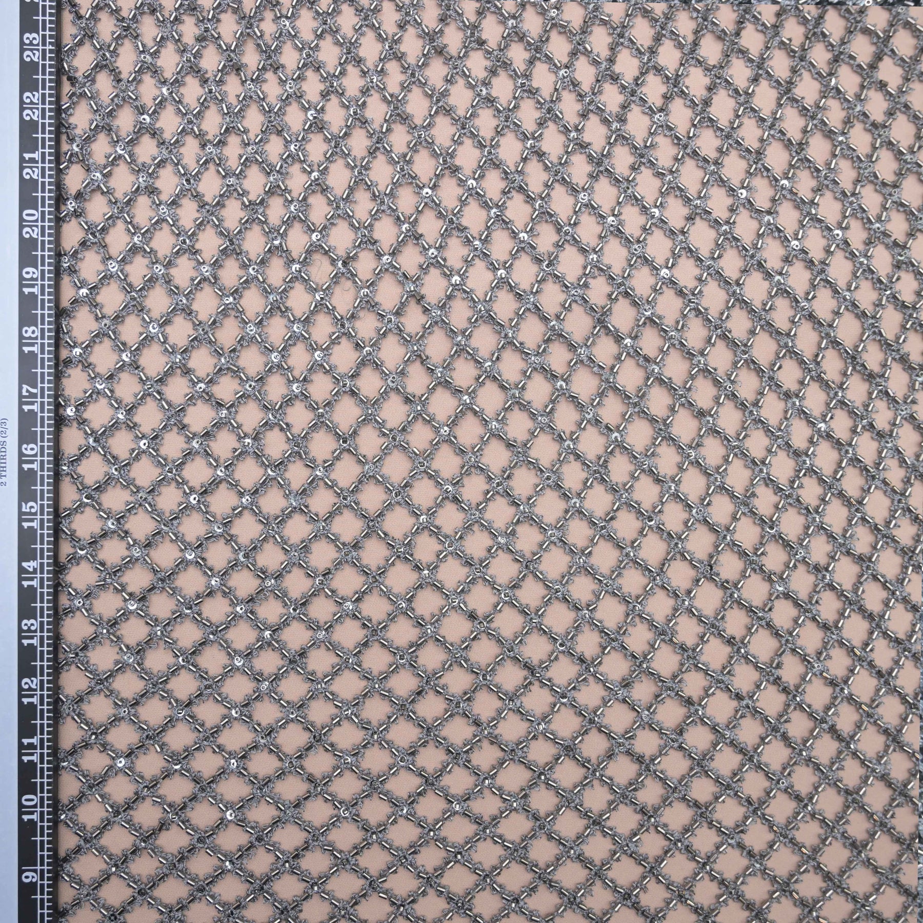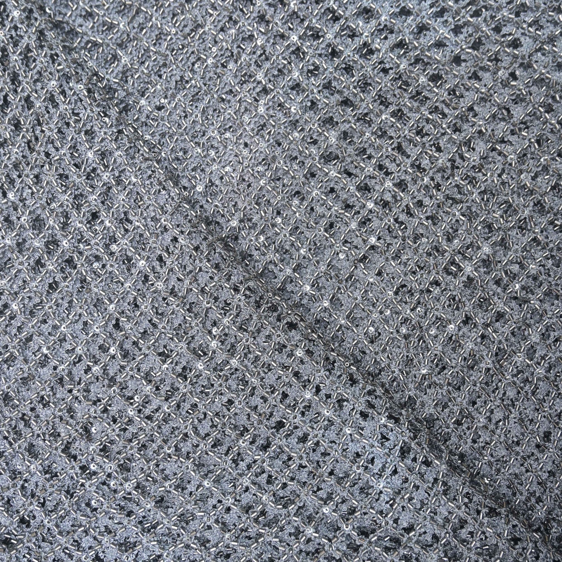 Elevate your creations with Ash Grey Imported Net Fabric featuring elegant Cutdana Embroidery. Crafted on a fine imported net base, showcases intricate cutdana work that adds a refined shimmer against the deep black tone. This fabric embodies luxury, craftsmanship, and modern elegance.