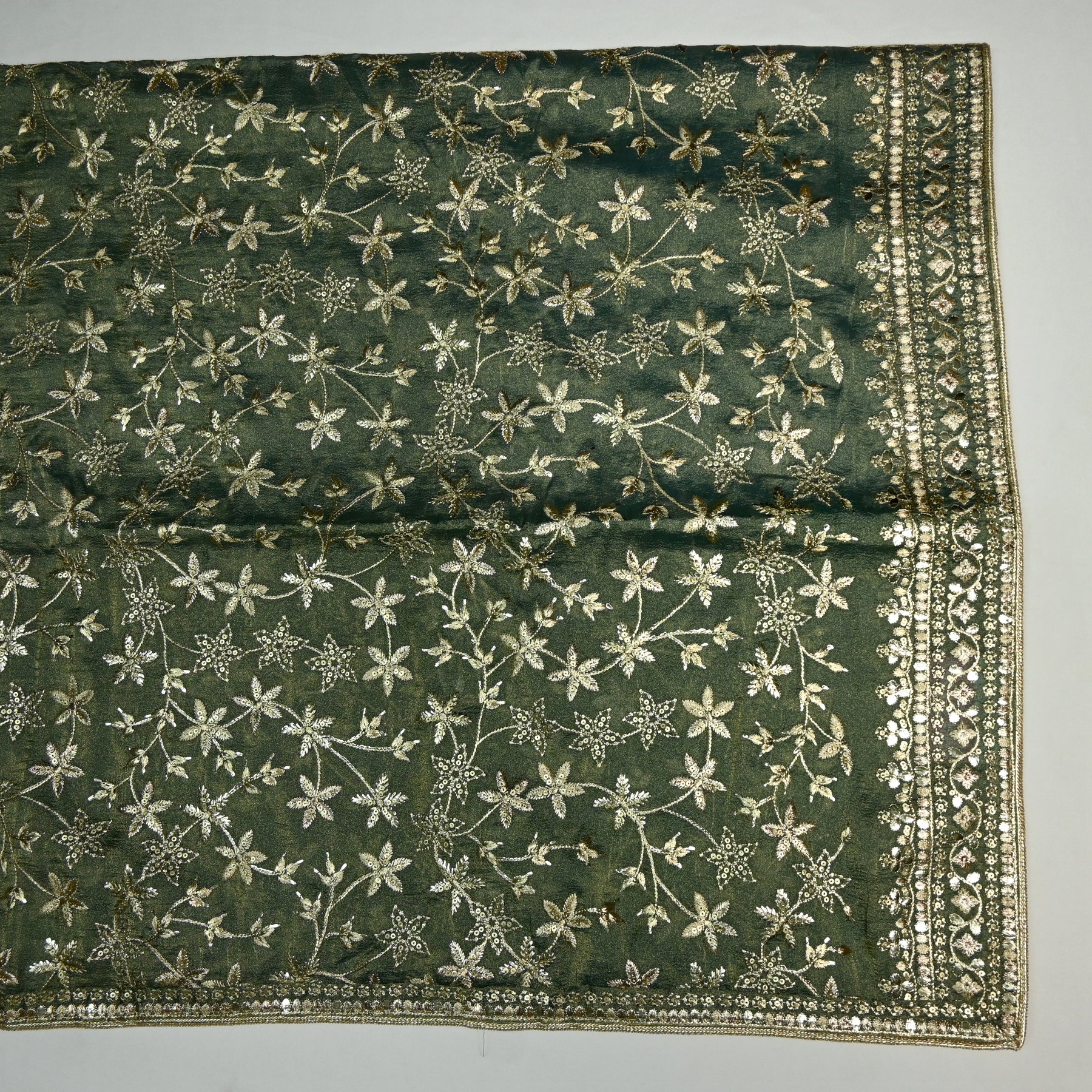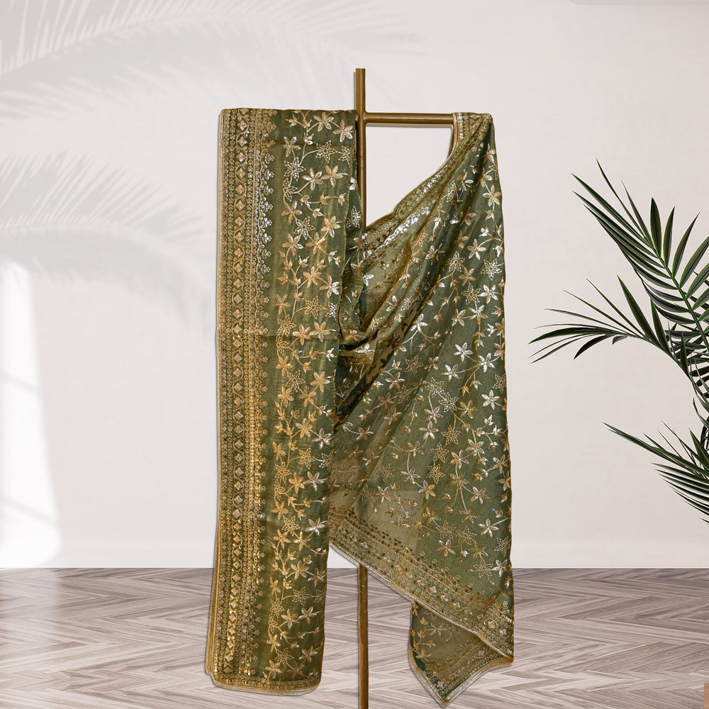 Crafted on premium tissue fabric, it carries a natural shimmer that enhances the overall look. The dupatta is beautifully decorated with intricate zari and sequin work, giving it a rich and festive appeal. The highlight is its ornate handcrafted border, which frames the piece with elegance and makes it stand out on any attire.