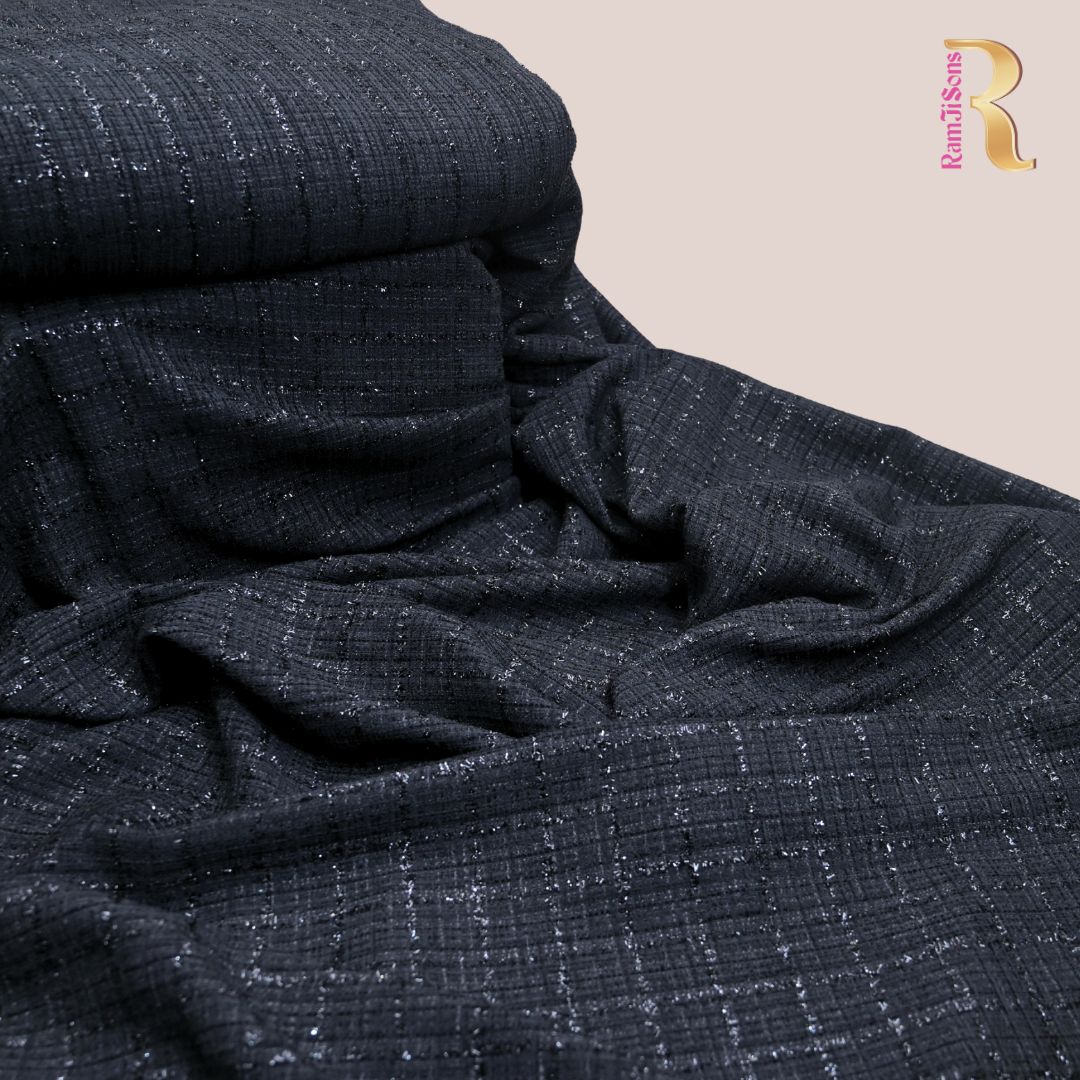 This fabric features a dark tweed-style weave with a refined, textured surface. Subtle metallic flecks are interwoven throughout, creating a soft shimmer that adds depth and visual interest without overpowering the design. The structured weave gives it a durable yet elegant feel, making it suitable for tailored garments, jackets, skirts, or statement upholstery. Its rich charcoal tone and understated sparkle lend a modern, sophisticated character with a timeless appeal.