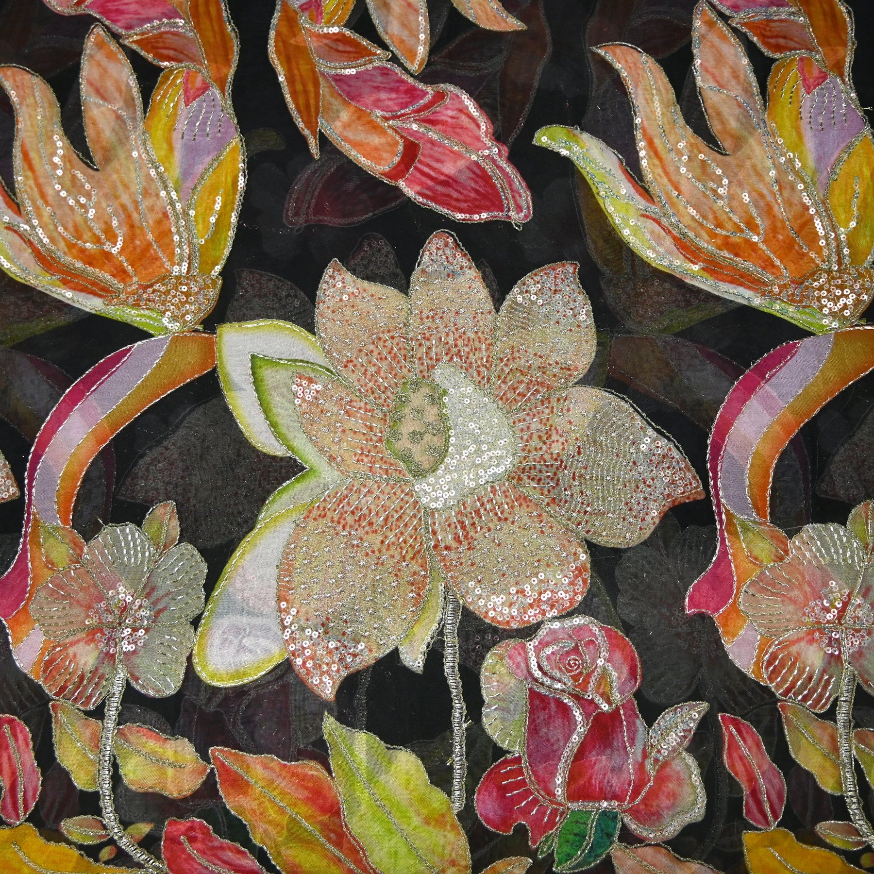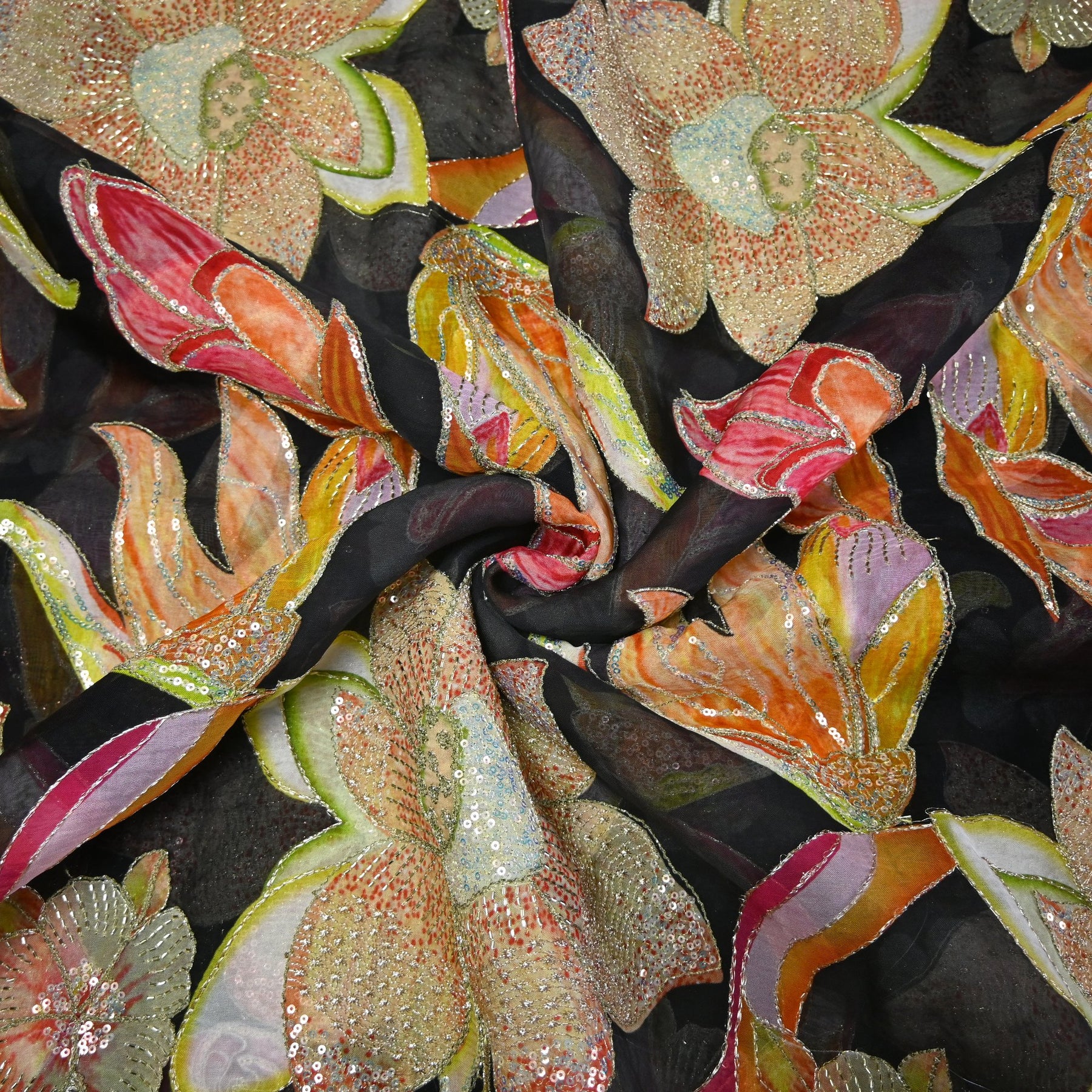 Its sheer, lightweight organza base offers a soft, graceful drape, while the shimmering zari and sequin detailing adds a luxurious festive sparkle. The combination of premium print quality and delicate embroidery makes this fabric ideal for modern couture and high-fashion creations.