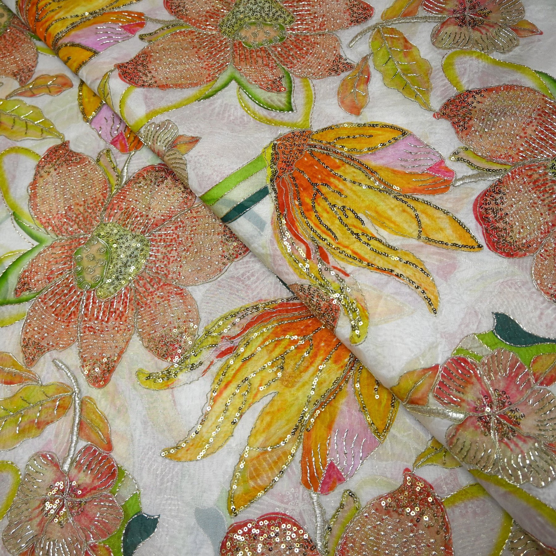 Its sheer, lightweight organza base offers a soft, graceful drape, while the shimmering zari and sequin detailing adds a luxurious festive sparkle. The combination of premium print quality and delicate embroidery makes this fabric ideal for modern couture and high-fashion creations.