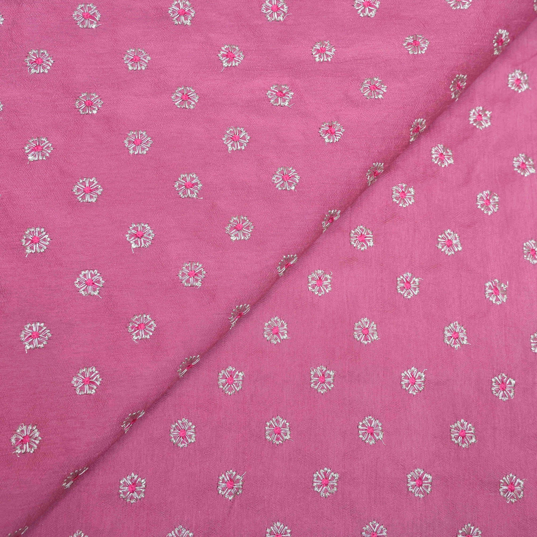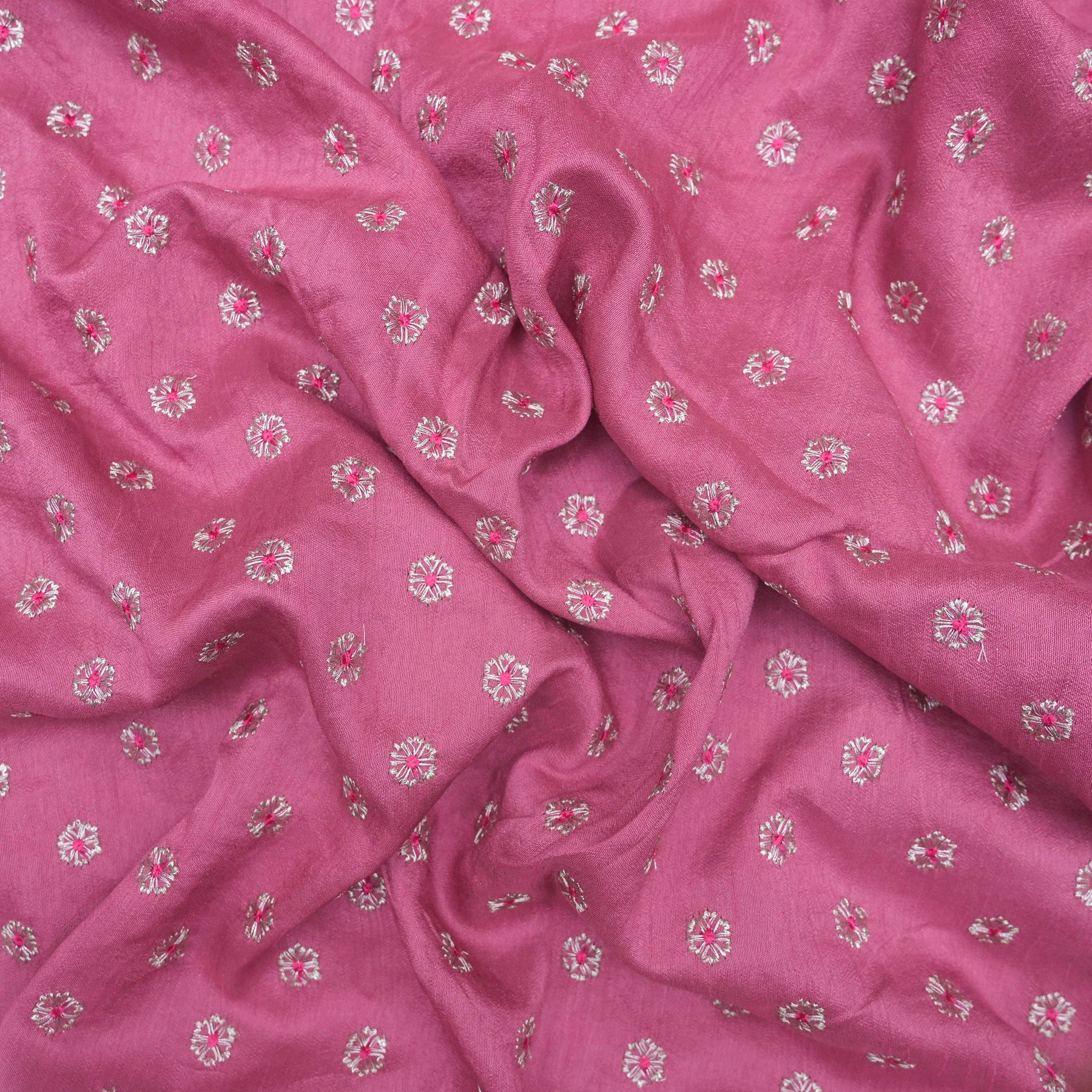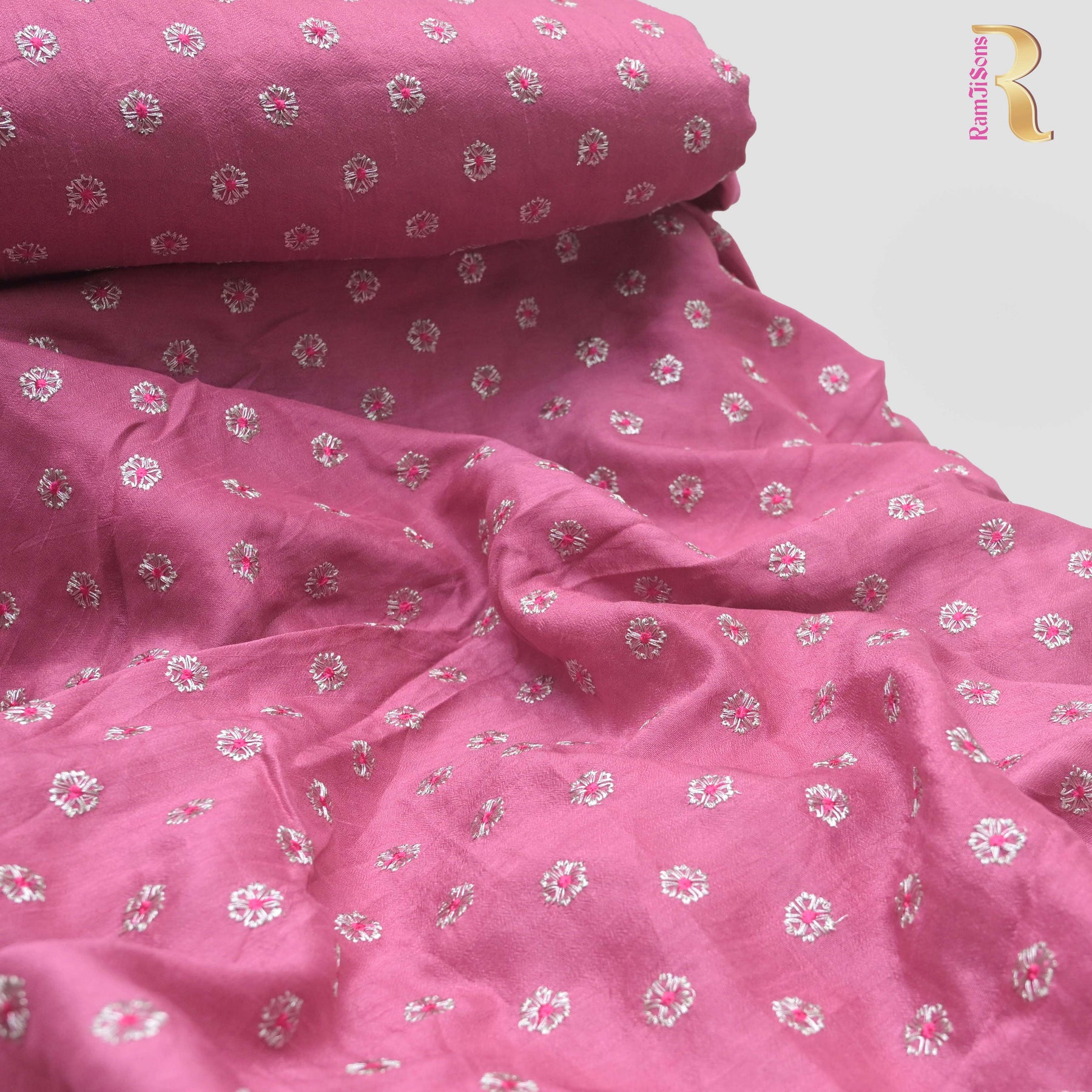 This elegant raw silk embroidery fabric showcases a rich, natural texture with a refined matte finish that highlights its artisanal charm. Adorned with delicately embroidered floral motifs, the fabric features fine metallic threadwork accented with subtle contrast highlights at the center, creating a graceful and balanced look. The evenly spaced butis add sophistication without overpowering the base.