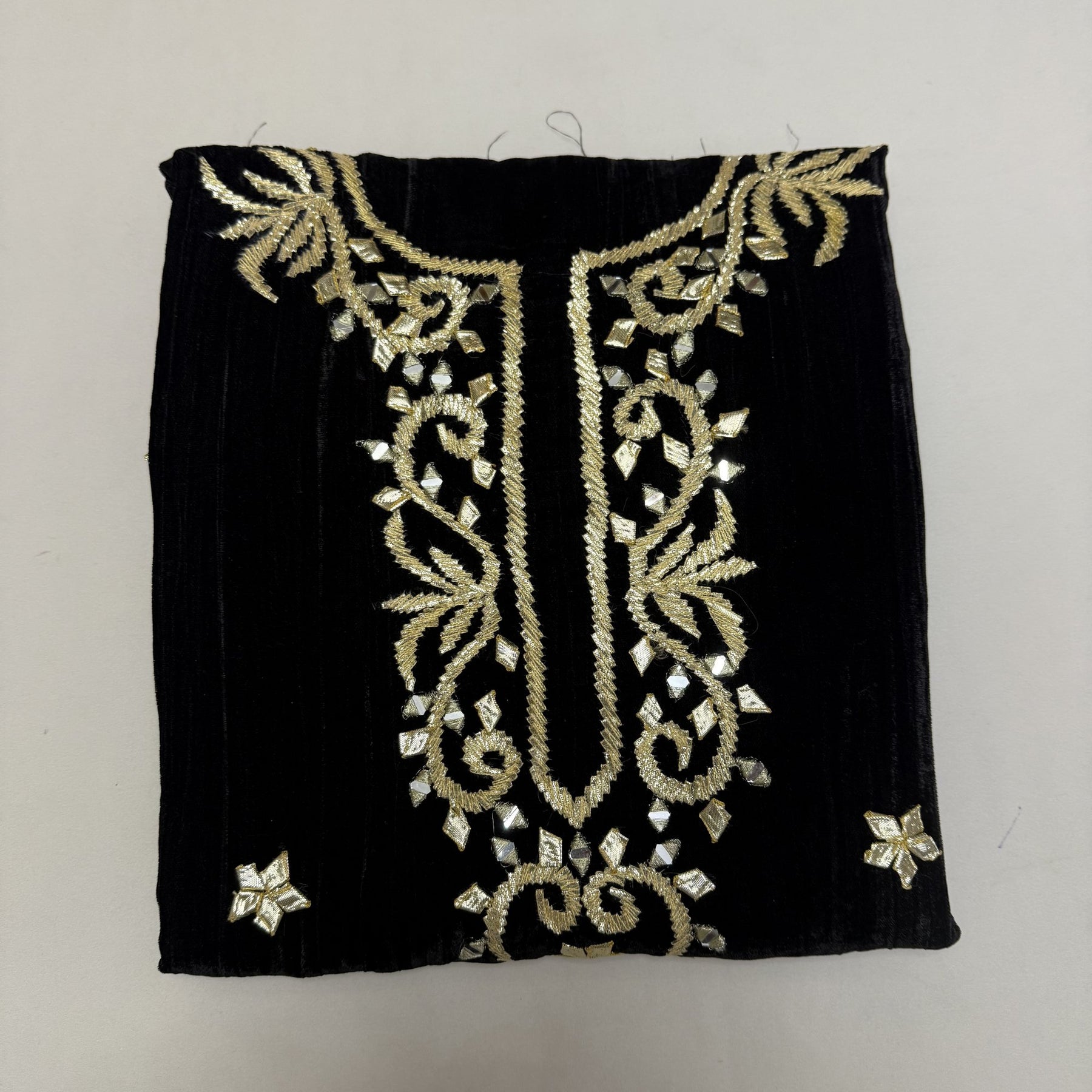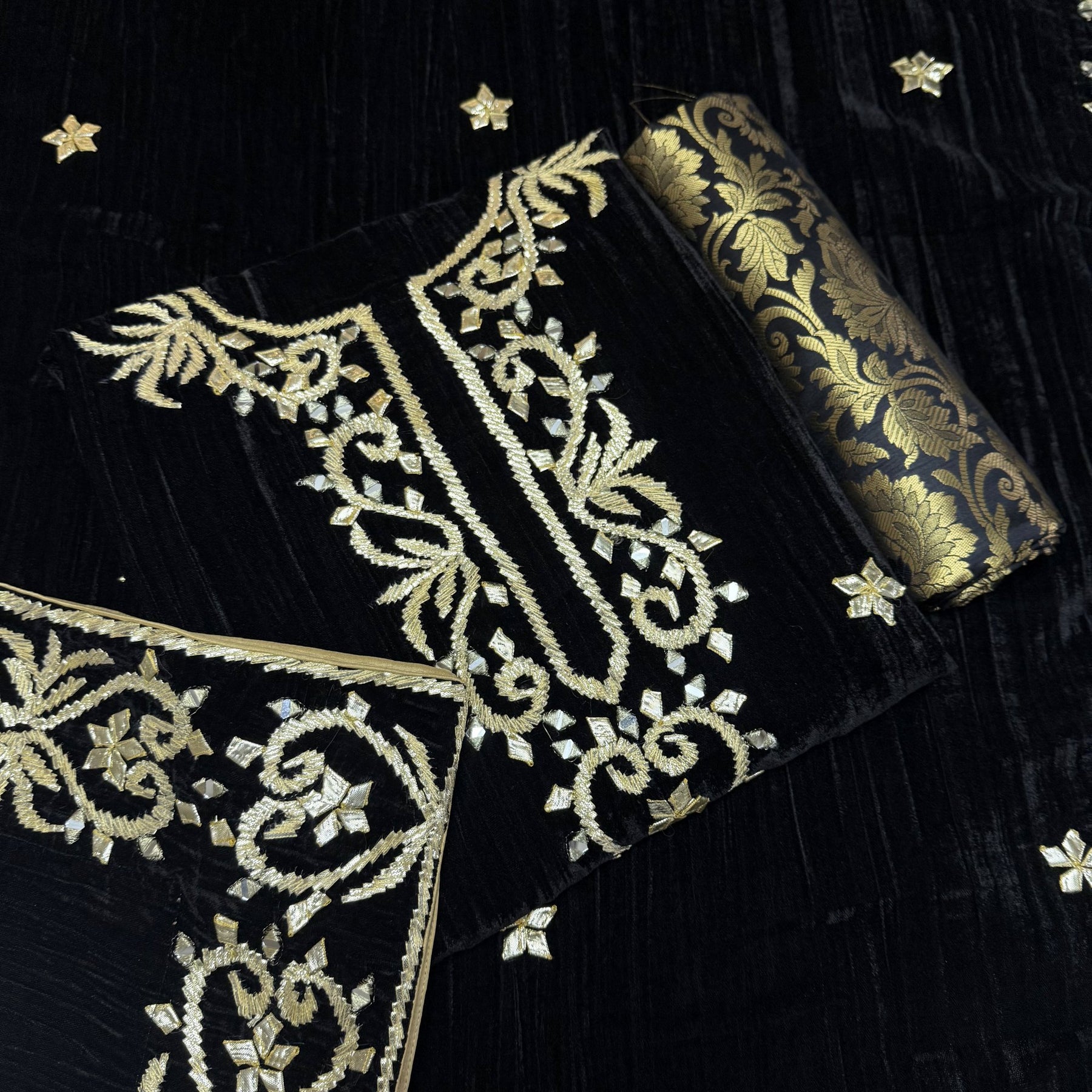 This elegant unstitched suit set is crafted from pure silk velvet, offering a luxurious shine and rich texture. The top features beautiful Gota Patti work paired with delicate mirror embellishments, giving it a festive and royal look.