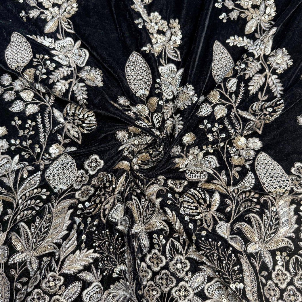 Ideal for ethnic wear, bridal outfits, party gowns, lehengas, blouses, sherwanis, dupattas, and home décor projects, this fabric drapes gracefully and exudes timeless elegance. The plush velvet base enhances the embroidery, making every piece look grand and sophisticated.