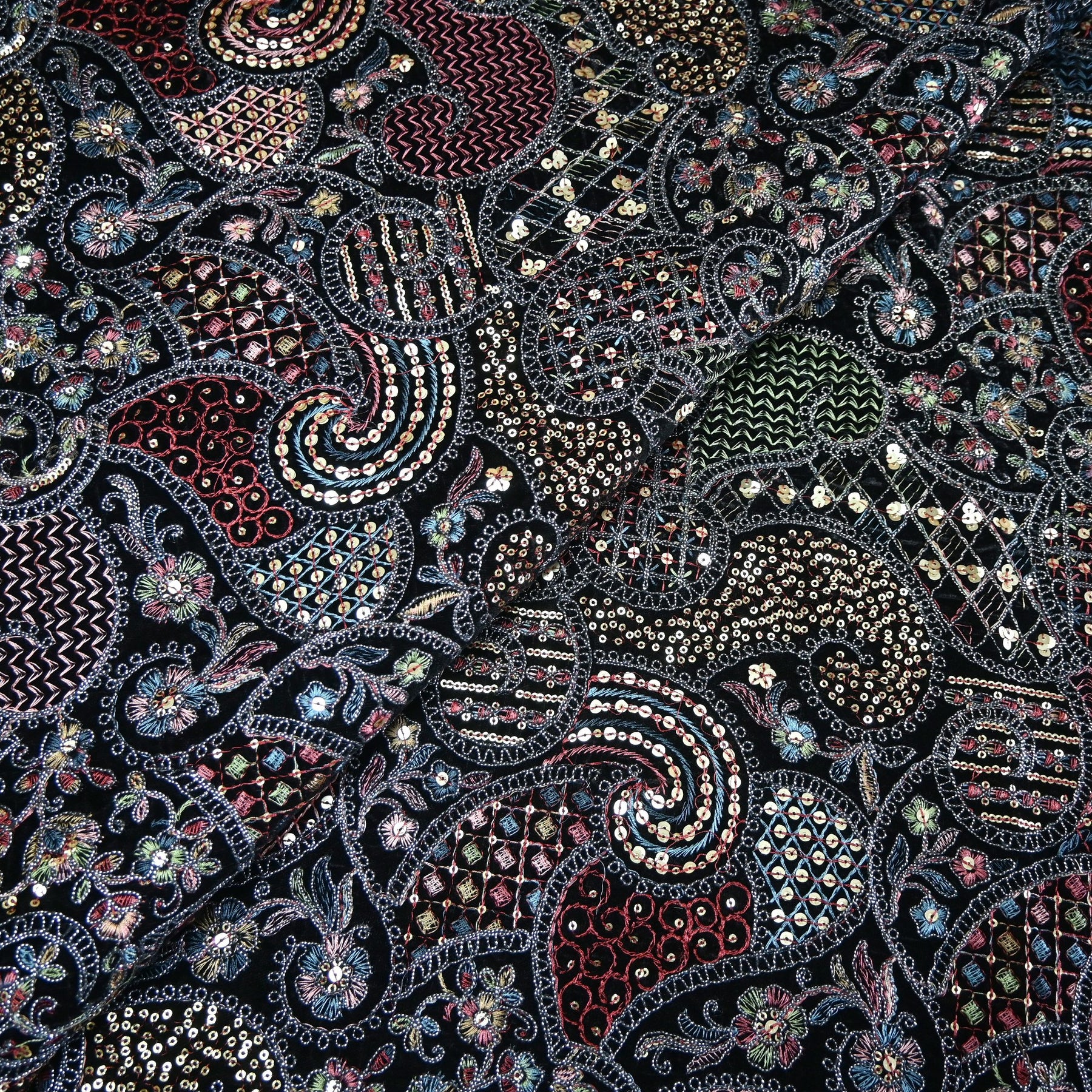 Velvet Thread With Zari Sequins Embroidery Fabric