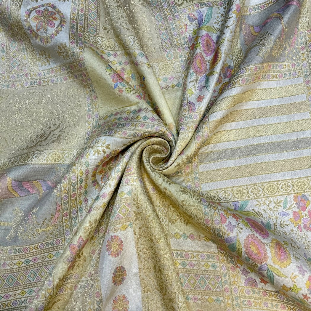 Elevate your ethnic style with our luxurious Dola Silk Position Print with Zari Jacquard Fabric, a perfect blend of elegance, tradition, and sophistication. Crafted from premium Dola silk, this fabric features exquisite position prints enhanced with rich zari jacquard weaving, adding a royal touch to every design.