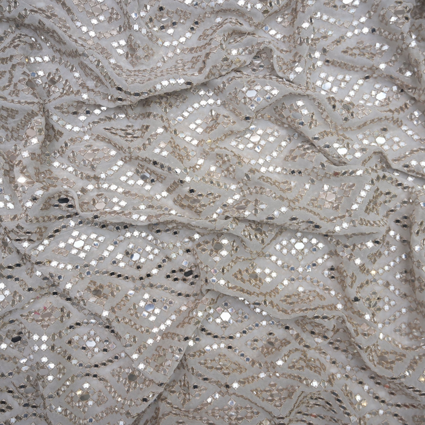 Elevate your creations with this premium white georgette dyeable fabric, beautifully adorned with allover gold Zari, Mirrorwork & Sequins embroidery. Crafted on a soft, flowy georgette base, this fabric offers effortless drape and elegance.
